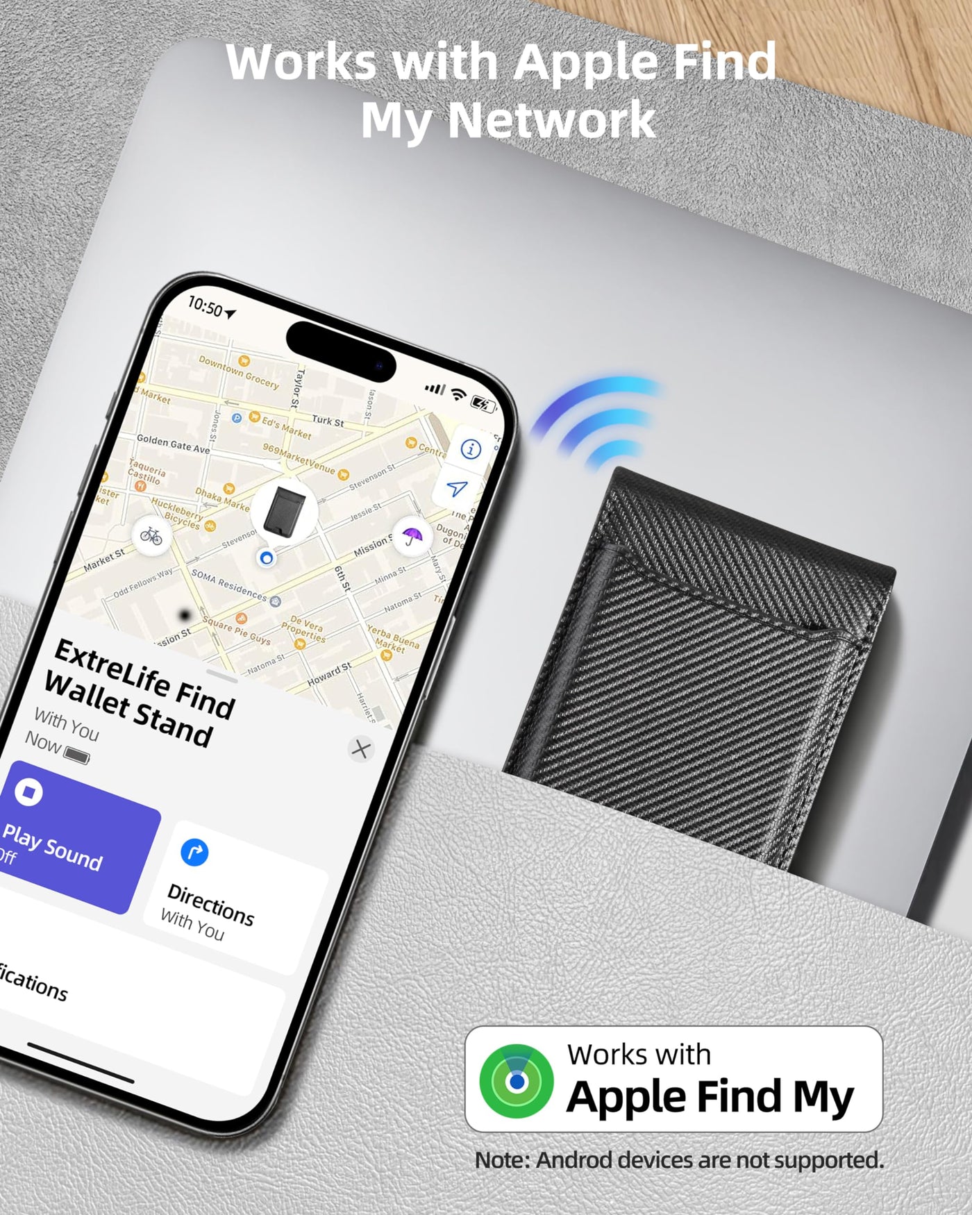 Q: How does the Find My functionality work with this wallet?A: This Magsafe wallet integrates seamlessly with the Apple Find My app, allowing you to track its real-time location via Bluetooth or GPS. You can play a sound to locate it nearby and receive notifications if you leave it behind.