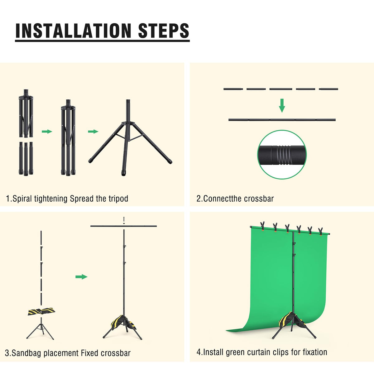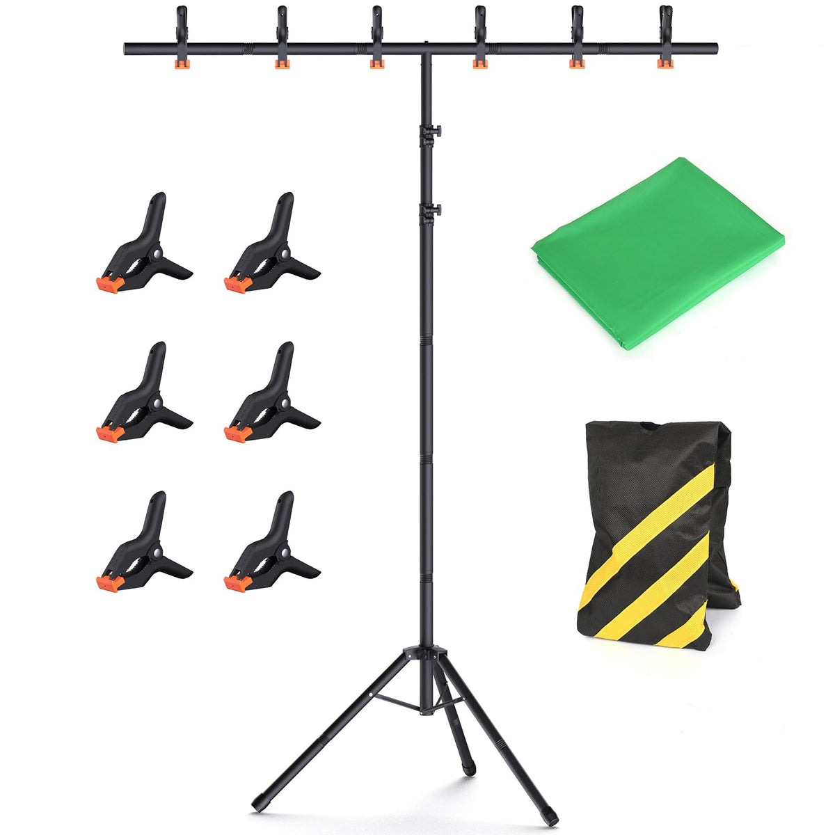 Q: What accessories are included with the backdrop kit?A: The kit includes 1 backdrop stand, 1 green screen, 6 spring clamps, 1 carry bag, and 1 sand bag, providing everything you need for your shoots.