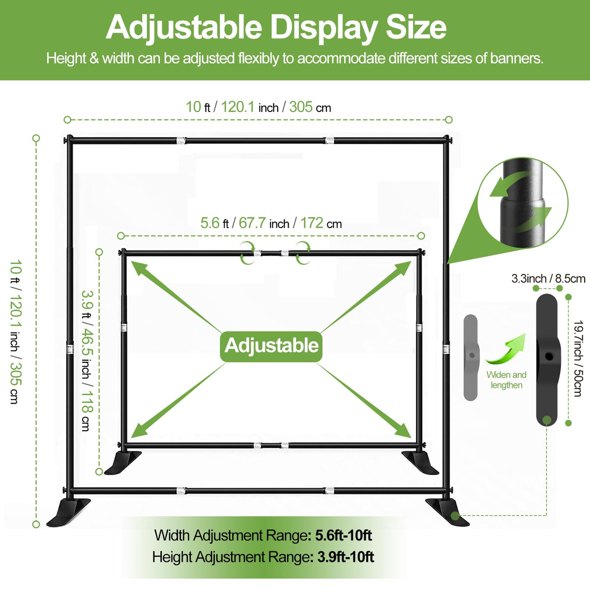 Q: Is the FUDESY backdrop stand adjustable in height and width?A: Yes, the FUDESY backdrop stand features a telescopic design that allows you to adjust the height from 3.9 feet to 10 feet and the width from 5.6 feet to 10 feet, making it versatile for different banner sizes.