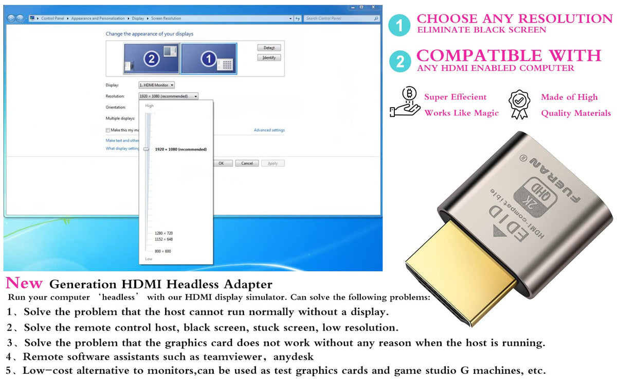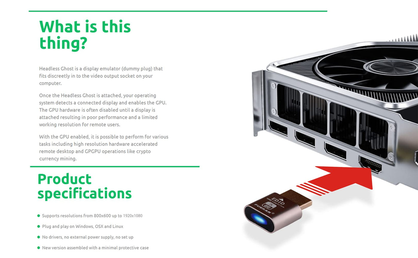 Headless Ghost Is A Display Emulator (Dummy Plug) That Fits Discreetly In To The Video Output Socket On Your Computer.Once The Headless Ghost Is Attached, Your Operating System Detects A Connected Display And Enables The Gpu. The Gpu Hardware Is Often Disabled Until A Display Is Attached Resulting In Poor Performance And A Limited Working Resolution For Remote Users.With The Gpu Enabled, It Is Possible To Perform For Various Tasks Including High Resolution Hardware Accelerated Remote Desktop And Gpgpu Operations Like Crypto Currency Mining.Emulates A Monitor Connected To The Graphics Card. Especially Good For Those Who Have&Nbsp;Graphics Cards Which Are Incompatible With Simple&Nbsp;Dummy Plugs. Perfect For Using With Pc, Mac Mini, Intel Nuc And Any Other Device With Hdmi Output.&Nbsp;Supported Resolutions:3840 X 2160@60Hz(With Hdmi2.0)2560X1440@60Hz1920X1200@60Hz1920X1080@60Hz1680X1050@60Hz1600X1200@60Hz1600X900@60Hz1440 X 900@60Hz1366 X768@60Hz1280X720@60Hz1024X768@60Hz800X600@60Hzproduct Dimension :&Nbsp;1.1X0.79X0.32&Nbsp;&Nbsp;Inbox Dimension :&Nbsp;5.12X3.54X0.39&Nbsp;&Nbsp;Innet Weight: 0.35Ougross Weight :0.36Oupacking :1 &Nbsp;
