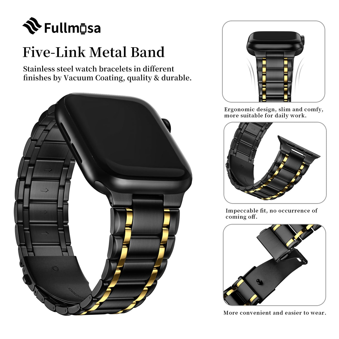 Q: What materials are used in the Fullmosa Apple Watch band?A: The band is made from high-quality 304 stainless steel, known for its durability and resistance to scratches. It features a sleek and stylish design, making it suitable for various occasions.