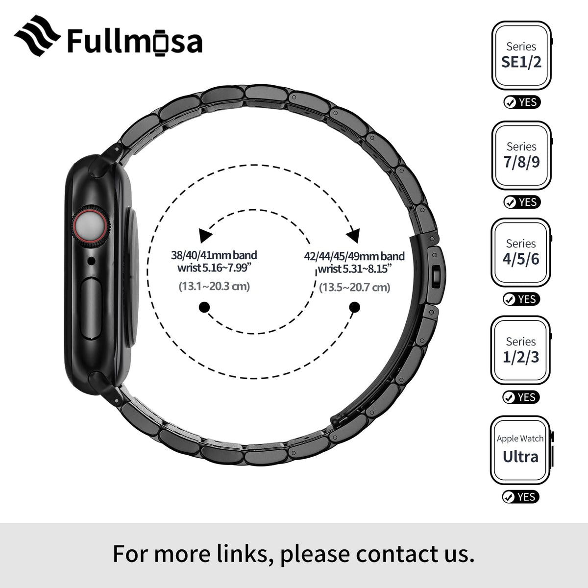 Q: Is the Fullmosa Apple Watch band compatible with all Apple Watch models?A: Yes, the Fullmosa Compatible Metal Apple Watch Band is designed to fit various Apple Watch models, including Series 1 through 9, SE, and Ultra, in sizes 38mm, 40mm, 41mm, 42mm, 44mm, and 45mm.