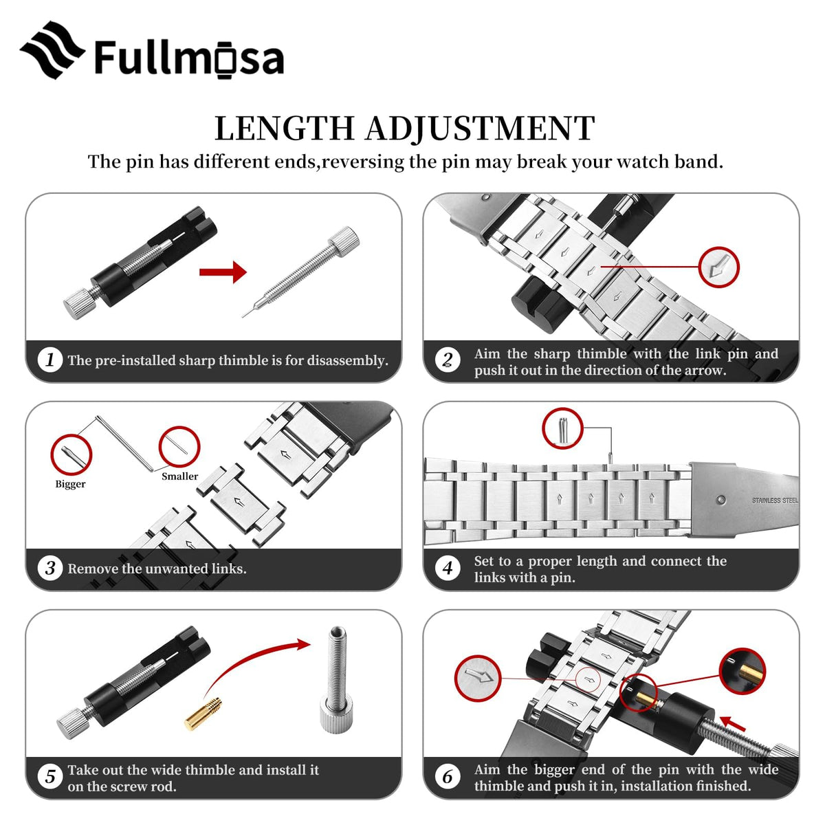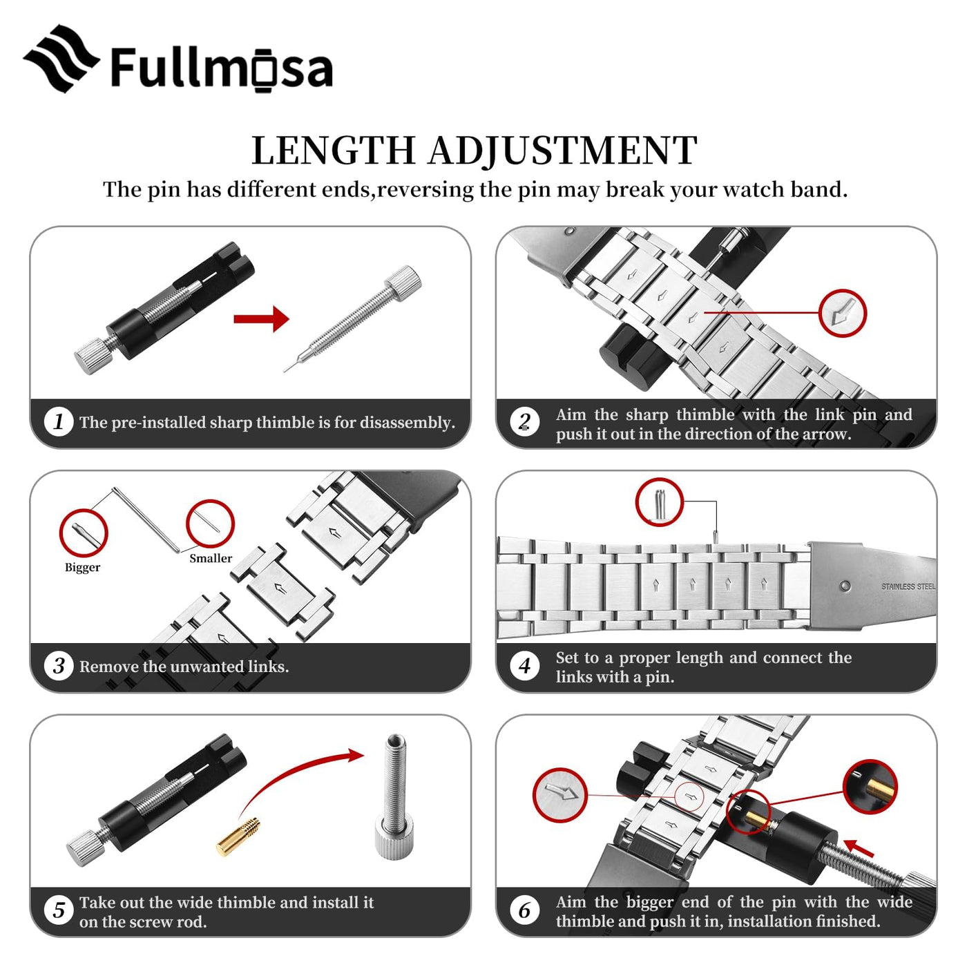 Q: How do I adjust the size of the Fullmosa Apple Watch band?A: The band comes with eight removable links, making it easy to adjust the size. You can follow the included instruction manual or video clip, and use the link removal tool provided to achieve a perfect fit for wrist sizes ranging from 5.31" to 8.15".