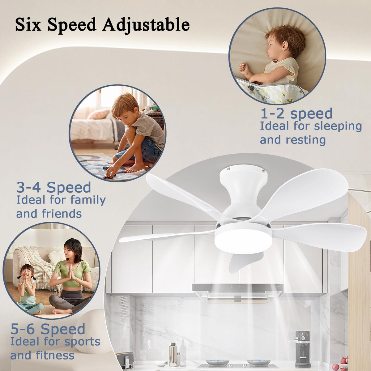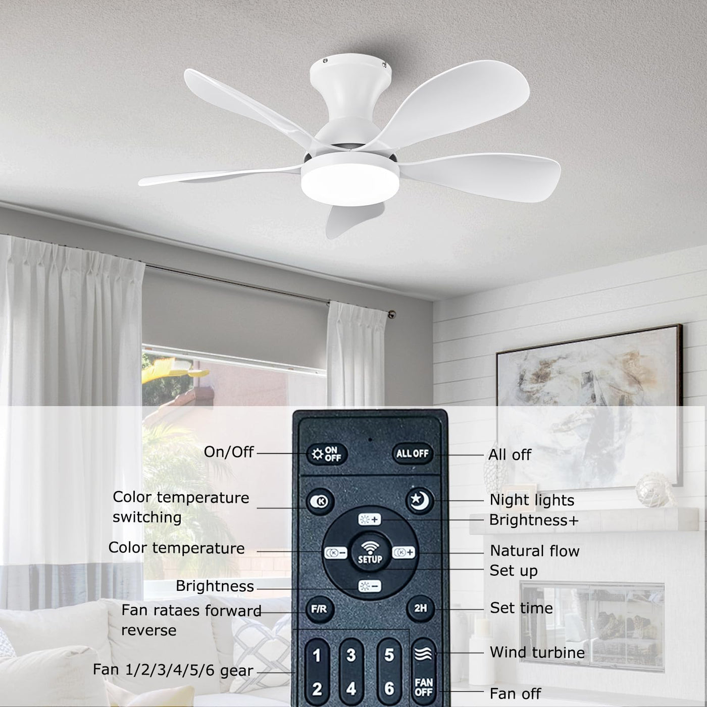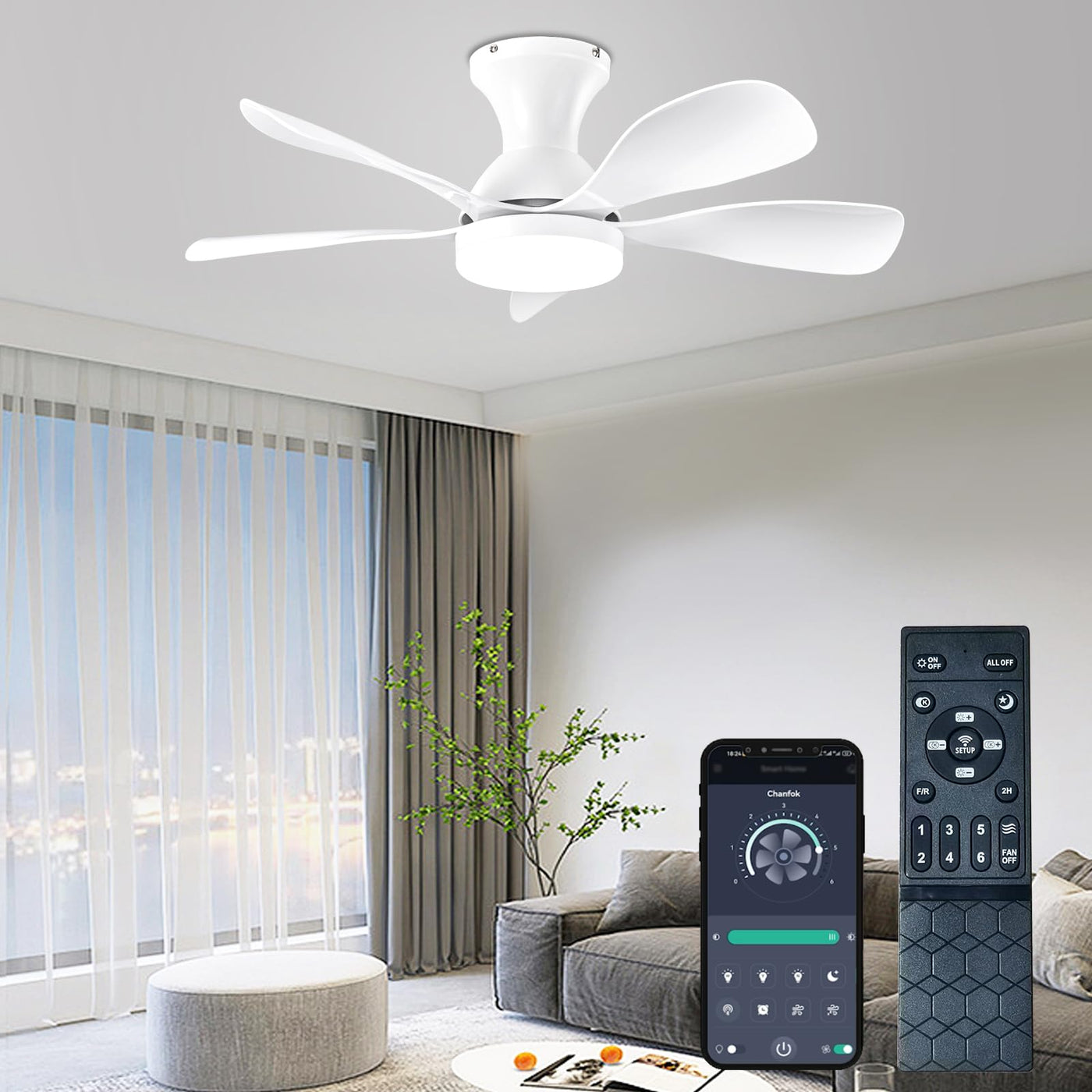Fumltp 33In Low Profile Ceiling Fans With Lights And Remote/App Control, White Modern Flush Mount Ceiling Fan With 5 Reversible