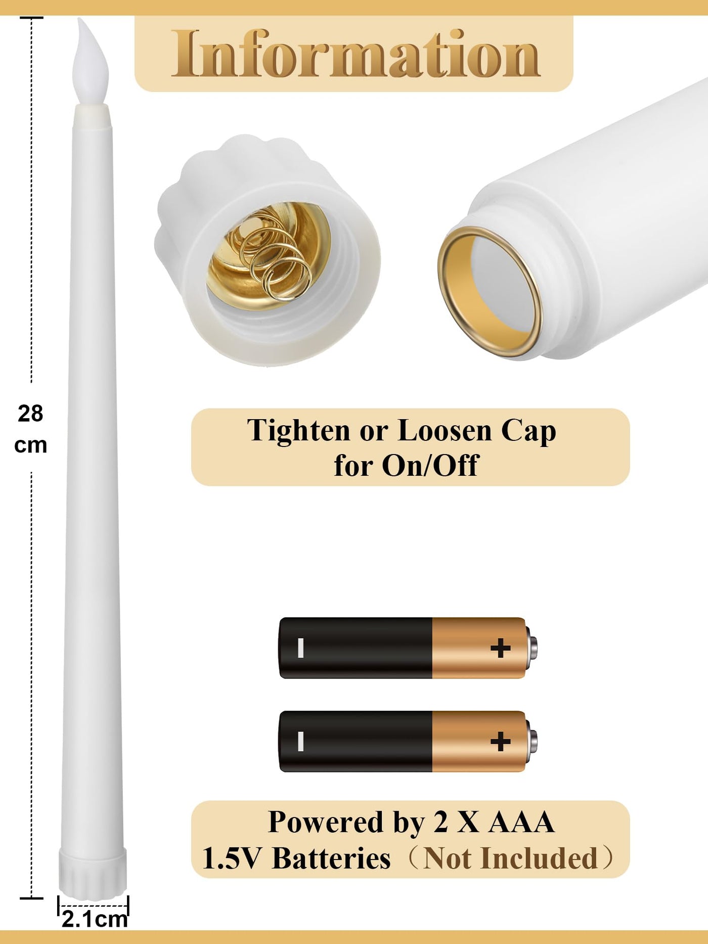 Q: What are the dimensions of the Funtery flameless LED taper candles?A: The Funtery flameless LED taper candles measure approximately 0.8 x 11 inches, making them suitable for all standard taper candle holders.