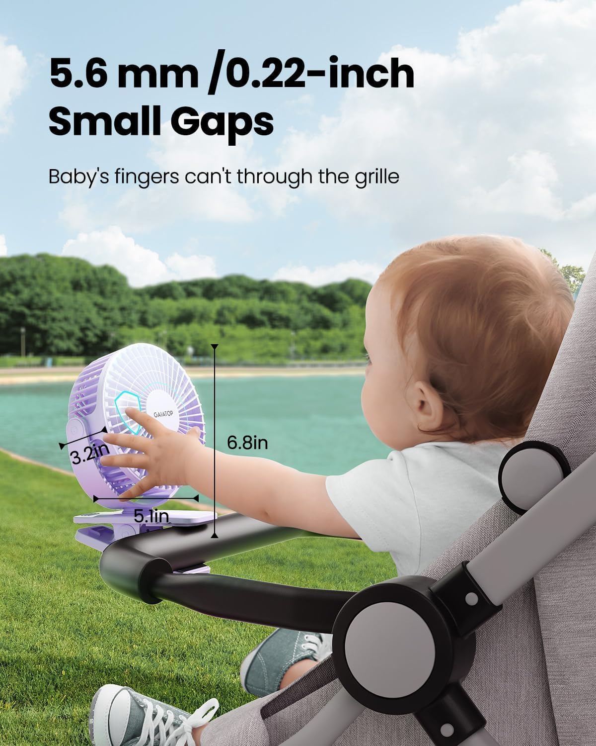 Q: Is this clip-on fan safe for babies?A: Yes, the mini clip fan is designed with safety in mind, featuring 5.5mm gaps to prevent little fingers from entering, making it safe for use around infants and toddlers.