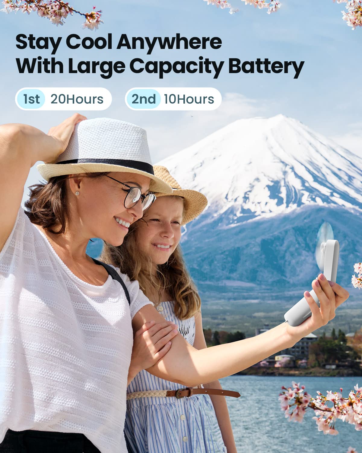 Q: Can I charge my phone with this handheld fan?A: Yes, this fan has a 1800mAh power bank function that allows you to charge your phone, laptop, or other devices using the 5V/1A USB output port in case of an emergency.