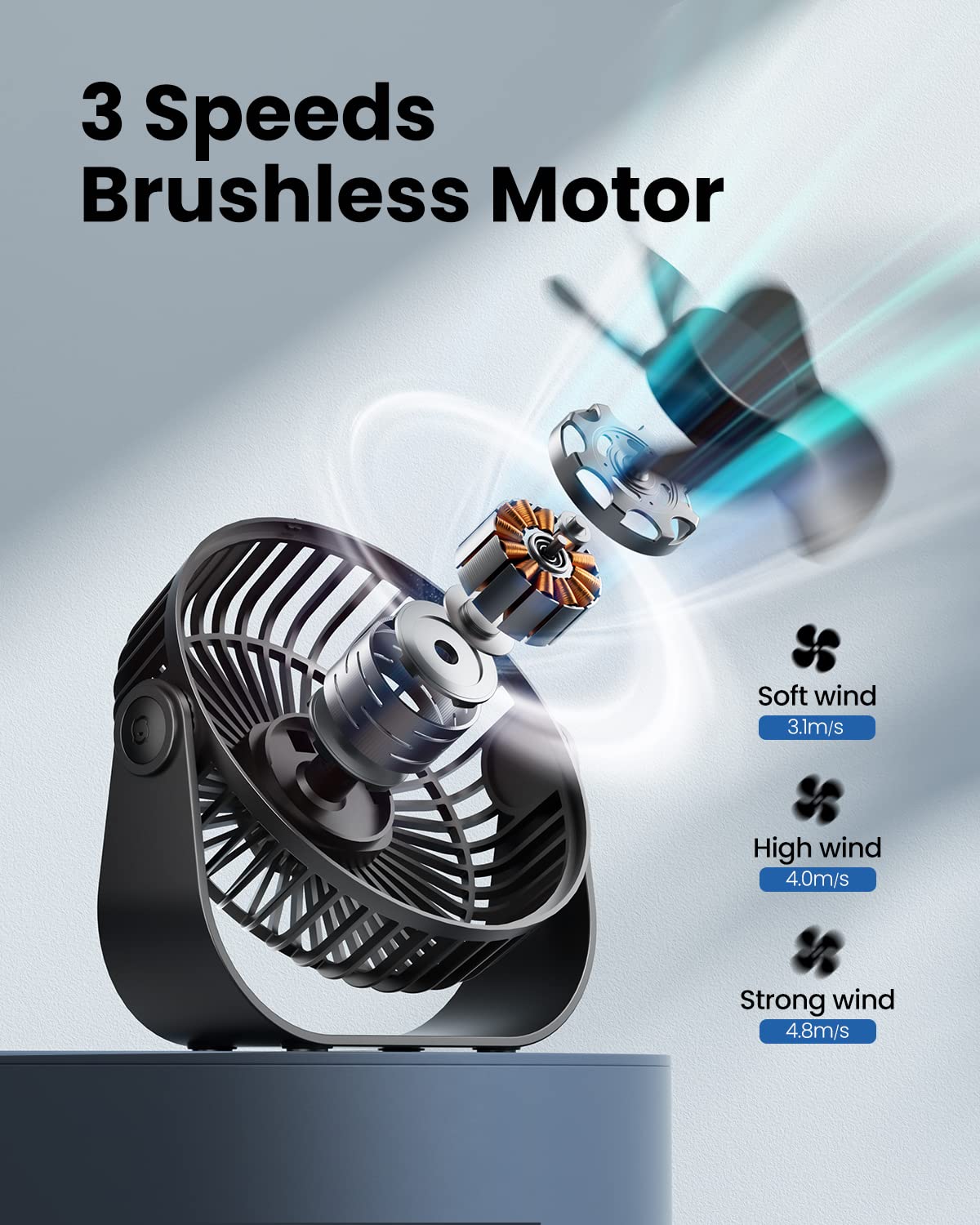 Q: What are the speed settings of the Gaiatop USB Desk Fan?A: The Gaiatop USB Desk Fan features 3 adjustable speed settings: Speed 1 offers a soft wind at 3.1m/s, Speed 2 provides a high wind at 4.0m/s, and Speed 3 delivers a strong wind at 4.8m/s, catering to your varying cooling needs.