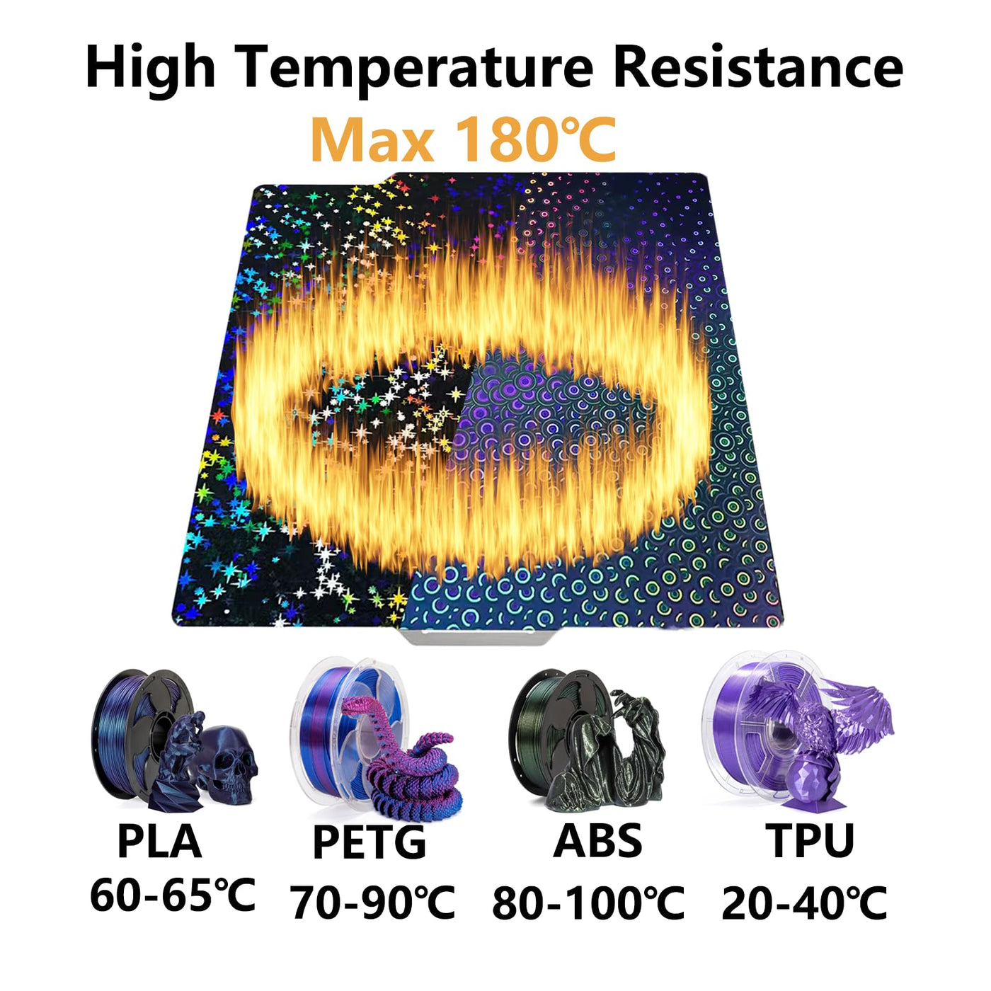 Q: What types of filaments can I use with this build plate?A: The build plate is suitable for various filaments, including PLA, TPU, PETG, and ABS. Recommended printing temperatures are PLA: 60-65℃, PETG: 70-80℃, ABS: 90-100℃, and TPU: 20-40℃.