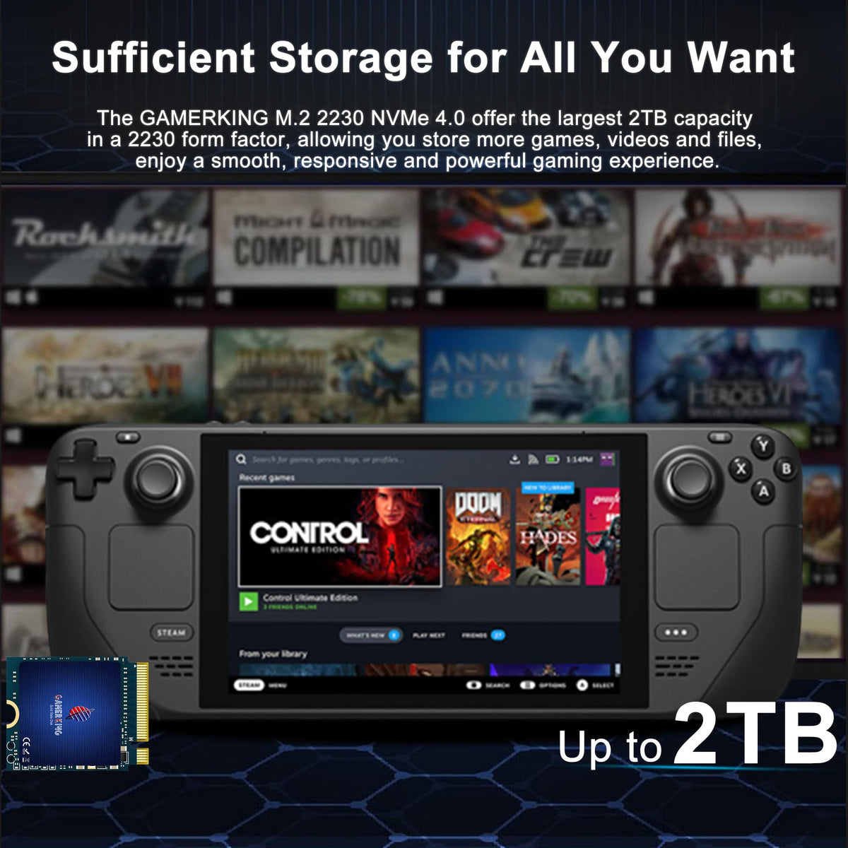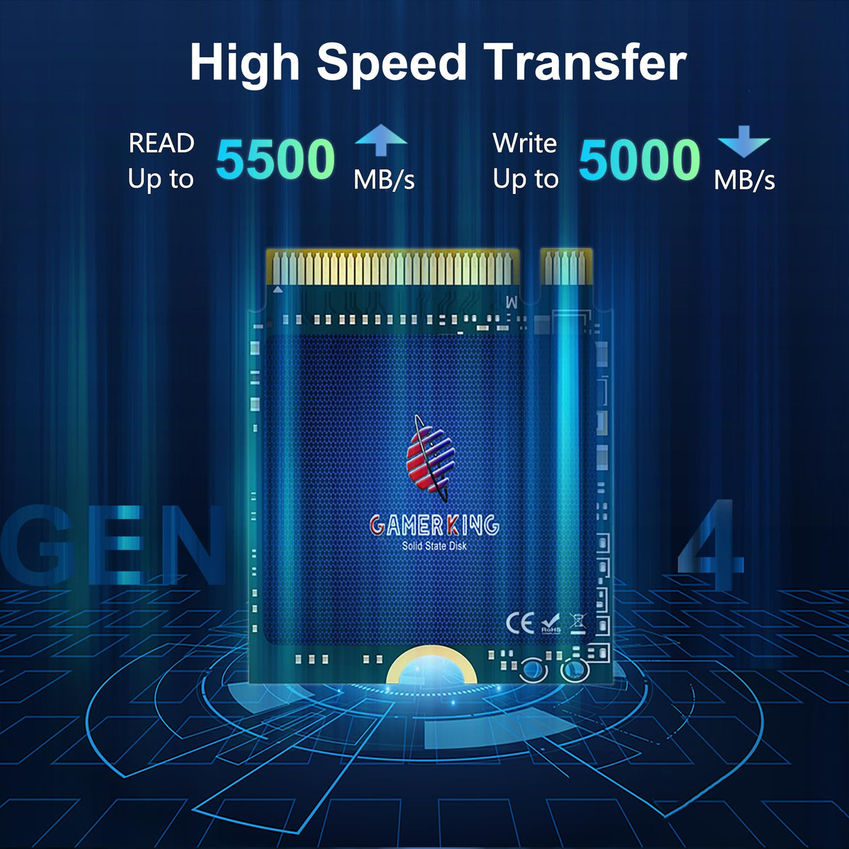 Play With Confidence! Get Ready To Download More Games To Your Gaming Device With Up To 2Tb Of Storage On M.2 2230 With The Gamerking M.2 2230 Nvme Pcie 4.0 Ssd. Bring Your Entire Game Library Anywhere Anytime And Start An Impressive Gaming Experience! Youre Able To Work Longer Before Recharging Your Laptop And Increase The Storage In Your Ultrathin Laptop/Steam Deck With 2230 Nvme Ssd With Pcie Gen 4.0. With Sequential Read Speeds Up To 5500Mb/S And Sequential Write Speeds Up To 5000Mb/S, Give The Speed You Want For Your Applications And Games. Compatible With Windows And Steam Os System. For Use With Your Existing Ultrathin Pcs/Gaming Console That Support M.2 2230 Slot, Pcie Gen 4.0 Interface (Backward Compatible With Gen3, Gen2) And Nvme Protocol. It May Be Necessary To Update The Bios Of Your Motherboard If This Ssd Cannot Be Recognized. Specifications Maximum Read Speed: 5500 Mb/S Maximum Write Speed: 5000 Mb/S Form Factor: 22Mmx30Mm Interface(S): Pcie Gen 4 X4 Key Type: M Key What'S Included Gamerking 2Tb Nvme M.2 2230 Ssd (Single-Sided) Limited Warranty This Gamerking M.2 2230 Ssd Comes With A Five-Year Warranty.
