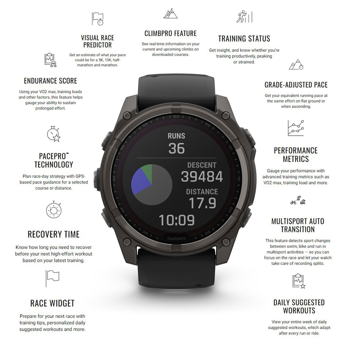 The Garmin Fenix 8 Amoled Is A High-Performance Multisport Gps Smartwatch Designed For Serious Athletes And Adventurers. Engineered To Endure The Toughest Conditions, It Features A Rugged Construction With A Dive-Rating Of 40 Meters, Leakproof Buttons, And A 1.4&Rdquo; Amoled Display Protected By A Scratch-Resistant Lens And Titanium Bezel. Built To Military Standards For Thermal, Shock, And Water Resistance, It Ensures Reliability In Extreme Environments. With An Impressive Battery Life Of Up To 29 Days In Smartwatch Mode, Fenix 8 Supports Long-Lasting Adventures And Training Sessions. It Includes A Built-In Speaker And Microphone For Hands-Free Phone Calls And Off-Grid Voice Commands, Offering Added Convenience. The Integrated Led Flashlight Provides Variable Intensities And A Red Safety Light, Enhancing Visibility And Safety In Low-Light Conditions. Fenix 8 Amoled Multisport Gps Smart Watch Excels In Health Monitoring And Training With Features Such As 24/7 , , And . Advanced Training Features Include Sport-Specific Strength Workouts, , The Fenix 8 Watch Offers Dynamic Round-Trip Routing, Multi-Band Gps For Precise Positioning, The Nextfork Map Guide And Courses With Turn-By-Turn Directions Ensure Reliable Navigation. The Fenix 8 Smart Watch Tracks A Wide Range Of Activities, Including Recreational Diving, Hiit Workouts, Backcountry Skiing, Mtb Dynamics, And Surf Activity.(This Is Not A Medical Device) Bundle Includes:Garmin Fenix 8 43Mm Amoled Multisport Gps Smartwatch, Silver With Whitestone Silicone Bandusb Type-C Female Adapterusb Charging Adapter6Ave Microfiber Cleaning Clothp-Bank Batteryair Pro Wireless Ear Buds