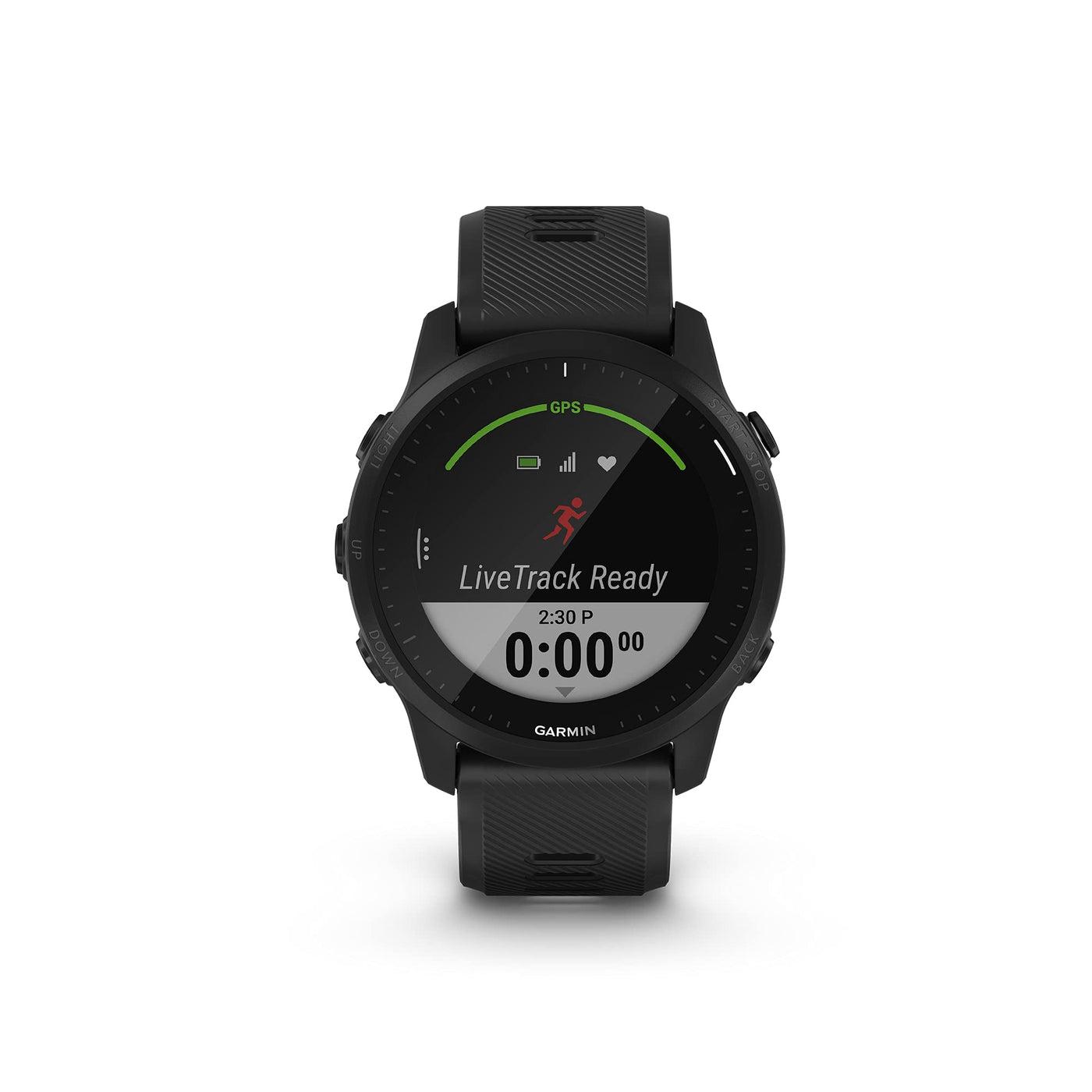 Q: What is the battery life of the Garmin Forerunner 945 LTE?A: In smartwatch mode, the battery lasts up to 2 weeks, while in GPS mode with music, it can last up to 12 hours and up to 7 hours with GPS mode, music, and LTE LiveTrack.