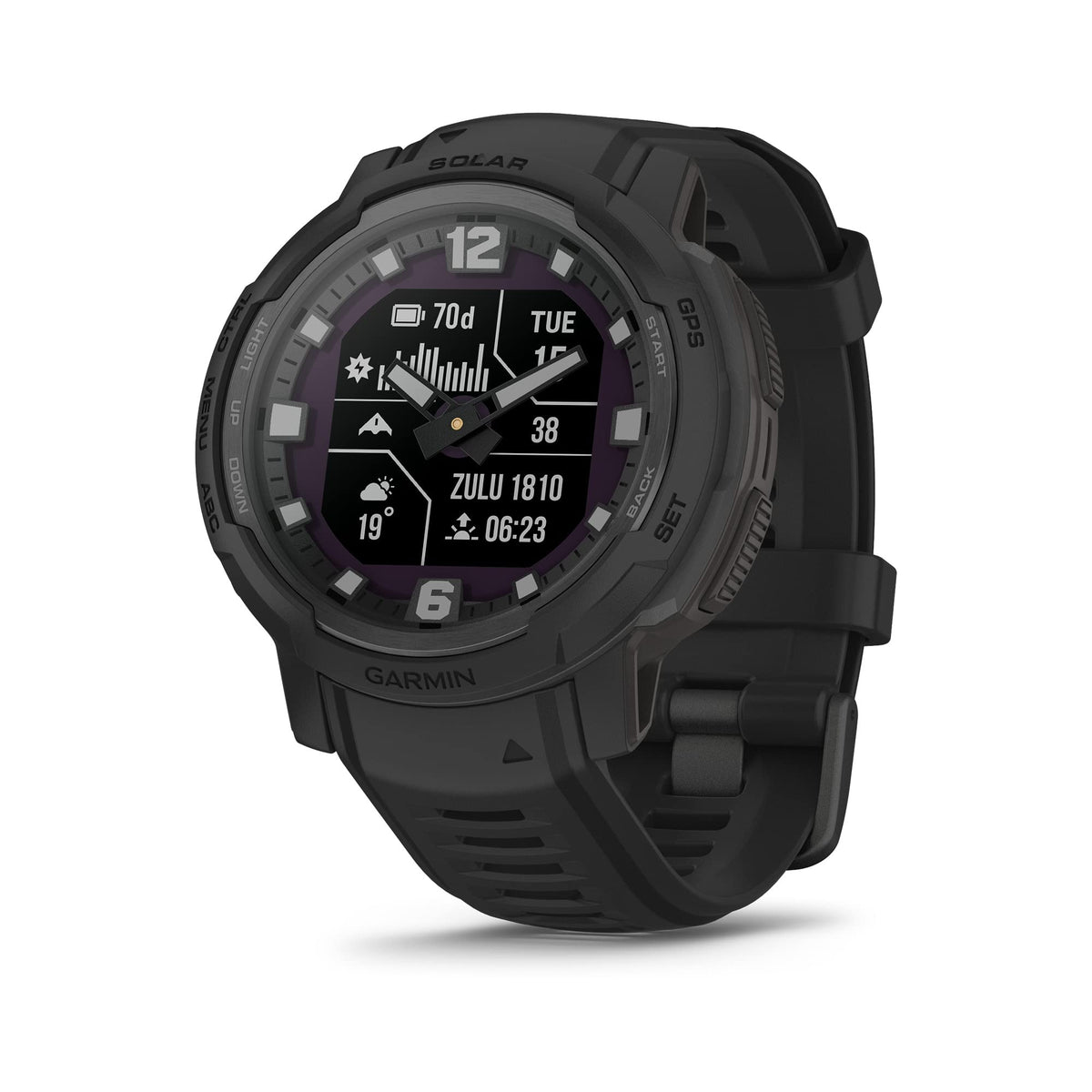 Q: What are the key features of the Garmin Instinct Crossover Solar - Tactical Edition?A: The Garmin Instinct Crossover Solar - Tactical Edition features a rugged design with luminescent analog watch hands, a high-resolution digital display, and advanced smart functionalities. It includes RevoDrive technology for accurate timekeeping, tactical-specific features like stealth mode, night vision compatibility, and dual-format GPS. Additionally, it offers all-day health monitoring, built-in sports apps, and infinite battery life in battery saver mode with solar charging.