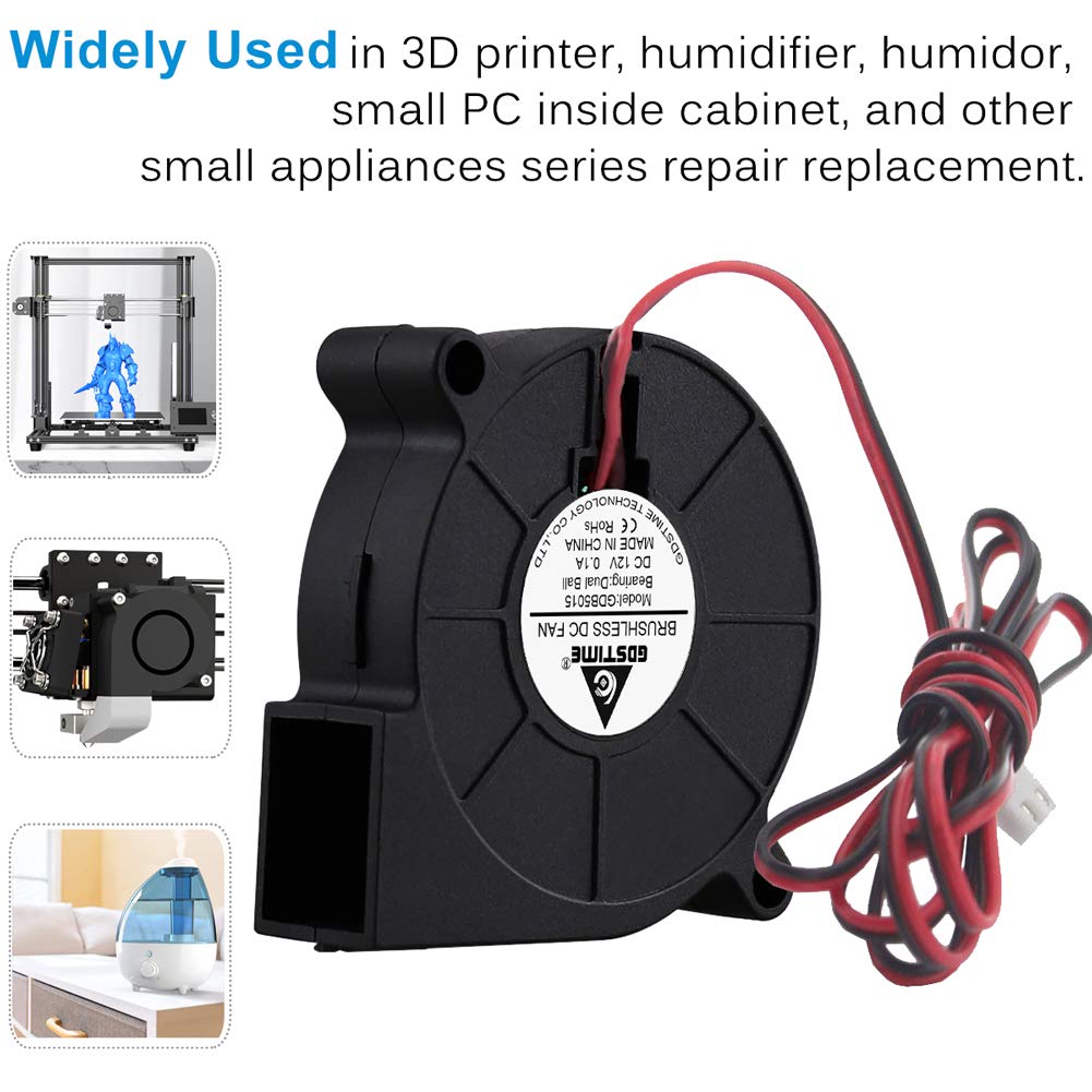 Product Description The Blower Fan Is Constructed Of Pbt Plastic Which Meets Ul 94 Flammability Standards. These Small 50 Mm Brushless Dc Blower Cooling Fan Is Often Used In 3D Printers, Spot Cooling Heat Sinks, It Also Can Cool Down Humidifier, Humidor, Aromatherapy, Heaters, Small Pc Inside Closet And More; Or Other Small Appliances Series Repair Replacement, These Fans Are Also Used To Cool Down Heating Elements And So On Faster. Specifications: Fan Size: 50X 50X15Mm Air Intake Size: 32.5Mm Air Outlet Size: 19.5X15Mm Mounting Spacing: 57 In Bearings: Dual Ball Rated Voltage: 12V Dc Operating Voltage: 7V To 13.5V Rated Current: 0.1 Amp Operating Temperature: 14? To 175 ? Power: 1.5 Watt Fan Speed: 6000 Rpm 10% Airflow: 5.36 Cfm Noise Level: 38.7 Dba Air Pressure: 1.21 In H2O Connector: Xh2.54-2Pin Cable Length: 3.28Ft (100Cm) Life Span: 50,000 Hours Net Weight: 30G / 1.06Oz Package List: 2X 5015 Blowers 4X Mounting Screws And Nuts