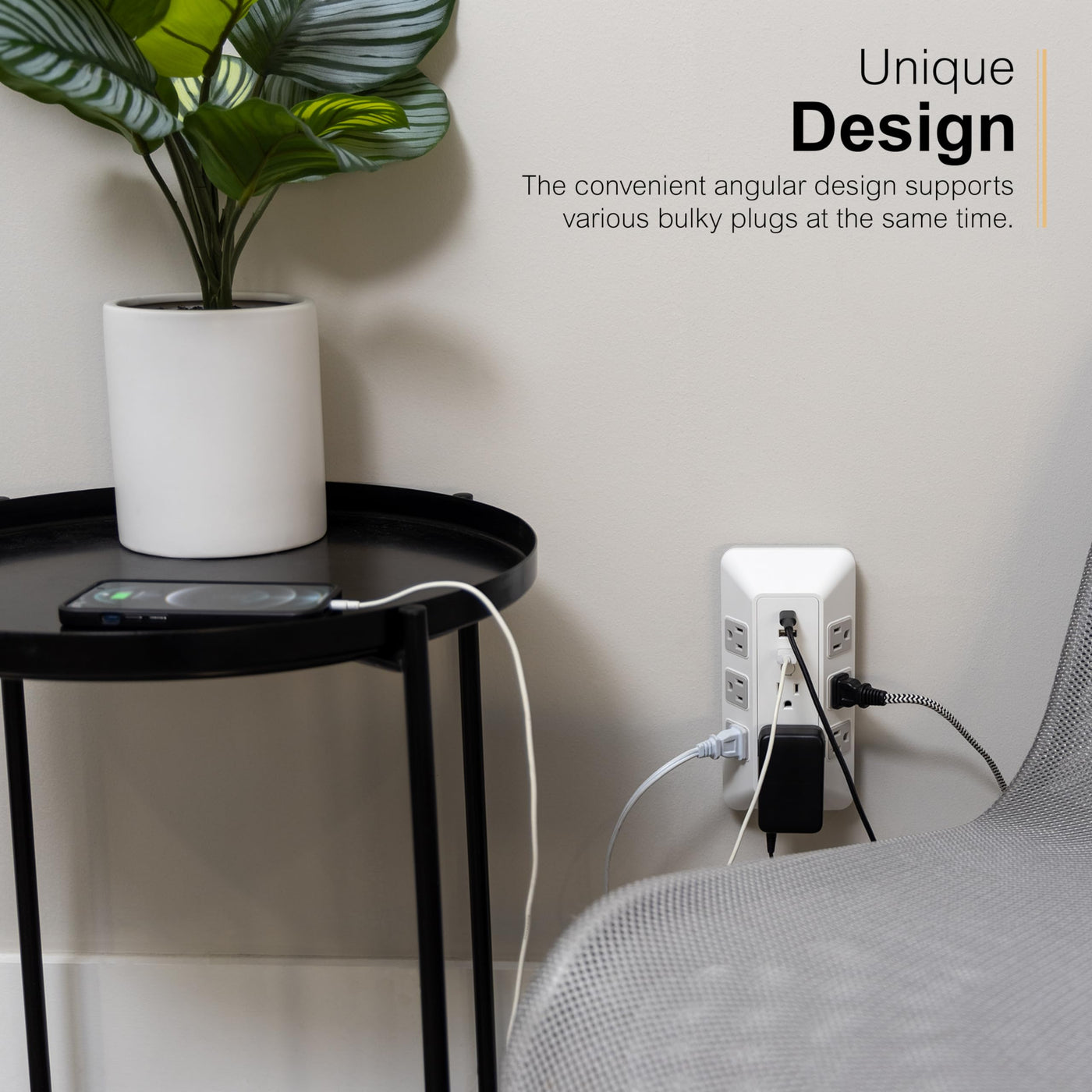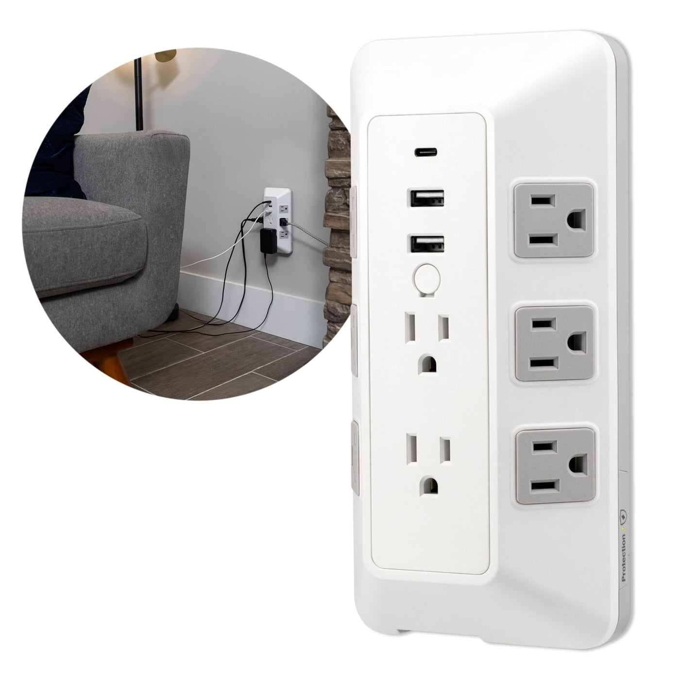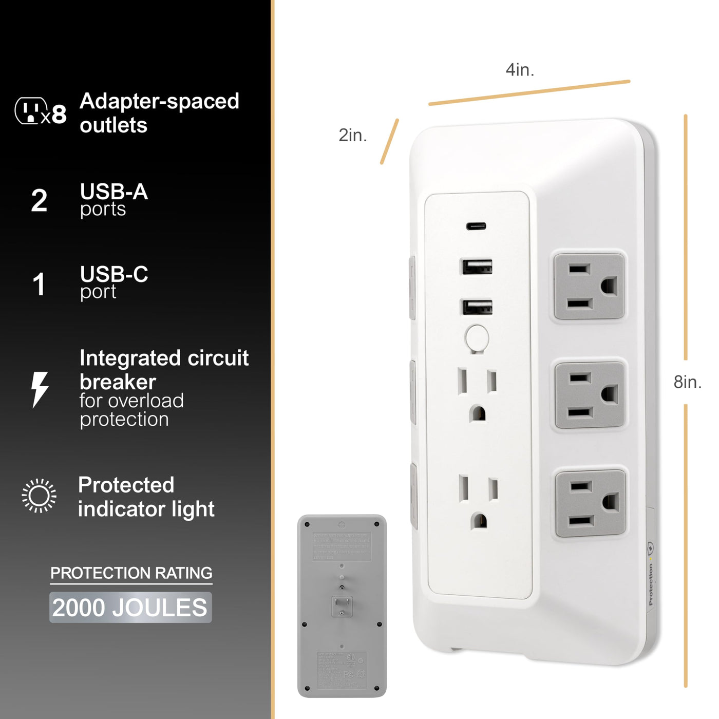 When Youre Tight On Space But Need Reliable Power, Trust The Ge-Branded 8-Outlet Surge Tap With Usb Charging. With Eight Adapter-Spaced, Three-Prong Outlets, Two Usb-A Ports And One Usb-C Port, This Versatile Surge Tap Creates A Centralized Powering Station For All Your Electronics Where You Need It Most. The Unique Angular Design Positions Outlets On Multiple Sides Of The Product, Letting You Use Several Bulky Plugs And Adapters At Once. Just Plug The Surge Tap Into A Standard Grounded Duplex Wall Receptacle And Youre Ready To Go. When It Comes To Protection, This Unit Has You Covered. Backed By A $200,000 Connected Equipment Policy And A Limited-Lifetime Replacement Plan, This Surge Tap Is Also Rated For 2,000 Joules Of Protection. This Product Follows The Highest Standards Of Industry Safety To Keep Your Electronics Safe. When Your Outlet Supply Comes Up Short, The Ge-Branded Surge Tap With Usb Charging Is The Solution.