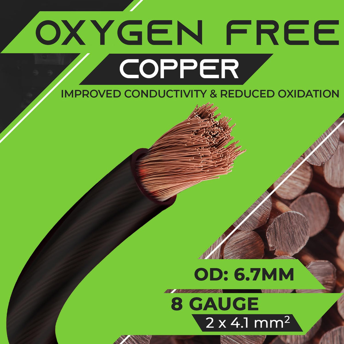 Q: What is the benefit of using Oxygen Free Copper (OFC) in automotive wiring?A: Oxygen Free Copper (OFC) is a superior conductor that provides excellent power transfer and efficiency, making it ideal for power and ground wiring in automotive applications. It minimizes signal loss and enhances the overall performance of your audio system.