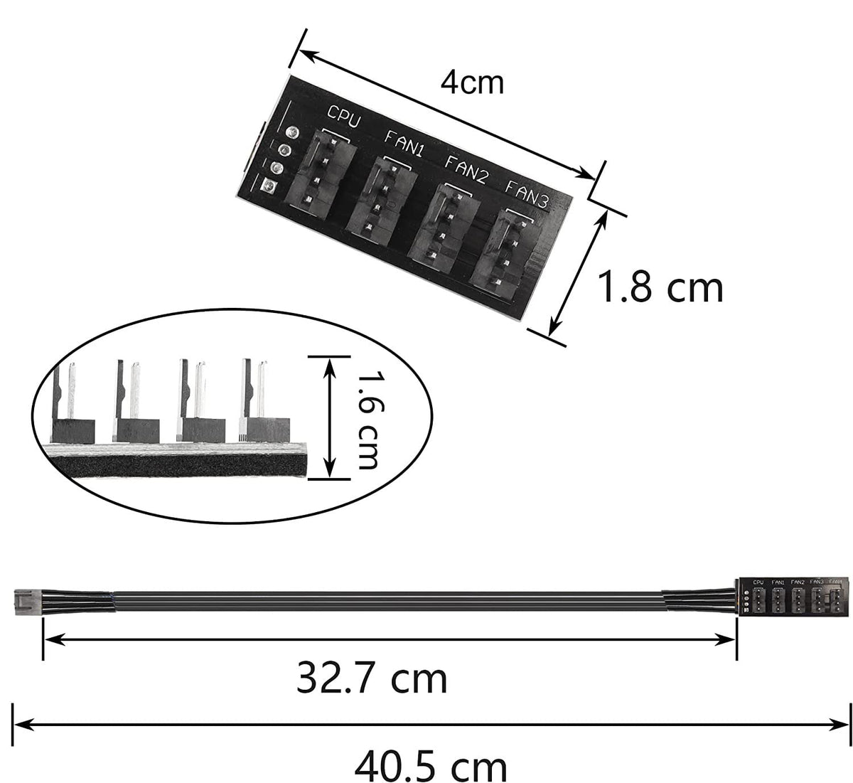 Q: What are the dimensions and material of the fan hub cable?A: The fan hub cable is 35cm (13.8 inches) long and features a nylon braided sleeve with tinned copper wire, ensuring durability and stable performance while reducing resistance.