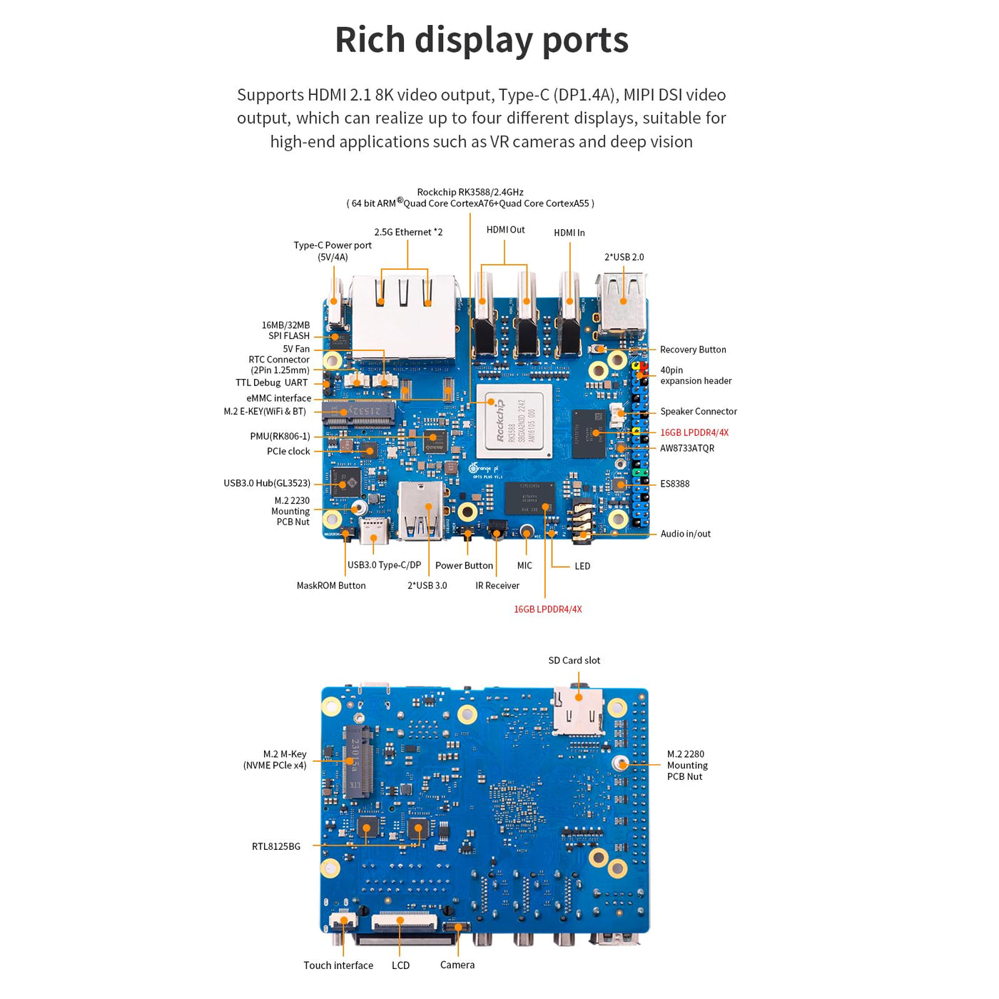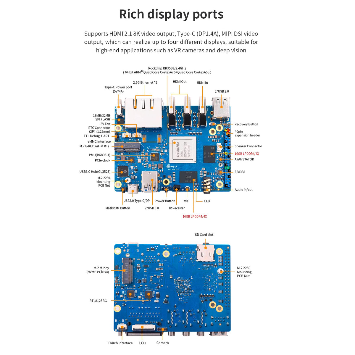 Product Parametersmain Control Chip: Rockchip Rk3588(8Nm Lp Process)Cpu: 8-Core 64-Bit Processor; Four Cortex-A76S And Four Cortex-A55S And Separate Neon Coprocessors The Cortex-A76 Clocked At 2.4Ghz And The Cortex-A55 Clocked At 1.8Ghzgpu: Integrated Arm Mali-G610 Built-In 3D Gpu Compatible With Opengl Es1.1/2.0/3.2, Opencl 2.2 And Vulkan 1.2Npu: The Embedded Npu Supports Int4/Int8/Int16/Fp16 Hybrid Operation, With A Computing Power Up To 6Toppmu: Rk806-1Ram: 32Gb (Lpddr4/4X)Storage: Qspi Nor Flash: 16Mb/32Mb Microsd Card Slot: Up To 128Gb Emmc Flash Socket, Can External 16 Gb / 32 Gb / 64 Gb / 128 Gb / 256 Gb Emmc Module The M.2 2280 Slot For Nvme Ssds (Pcie 3.0 X4) Is Up To 2,000 Mb/Susb: 2Xusb3.0; 2Xusb2.0; 1Xtype-Cvideo Output: 2X Hdmi 2.1 Output Up To 8K@60Fps 1X Type-C (Dp 1.4A) Output, Up To 8K@30Fps 1X Hdmi Input, Up To 4K@60Fps 1 X Mipi Dsi 4 Lane Output, Up To 4K@60Hztp Interface: 1X6Pin Fpc Socketcamera: 1Xmipi Csi 4 Laneaudio: Codec:Es8388 1X3. Audio Input/Output With 5Mm Headphone Jack 1Xmic Input 1Xhdmi 2.1 Earc 1X Speakerethernet: 2Xpcie 2.5G Lan (Rtl8125Bg)Expansion Port: 40Pin Double-Row Pin, With The Following Reuse Functions: Uart, I2C, Spi, Can, I2S, Pdm, Auddsm, Sdio, Pwm, Gpio.Pcie M.2 M-Key Socket: M.2 Connector M Key (Bottom) For Nvme With Pcie 3.0 X4 Lanes 2280 Ssdpcie M.2 E-Key Socket: M.2 Connector E Key (Top) For Connectivity With Pcie 2.0 X1/Pcm/Uart/Usb2.0, Supporting The 2230 Wi-Fi6 /Bt Modulekey: 1X Maskrom Key, 1Xrecovery, 1X Switch On/Off Key