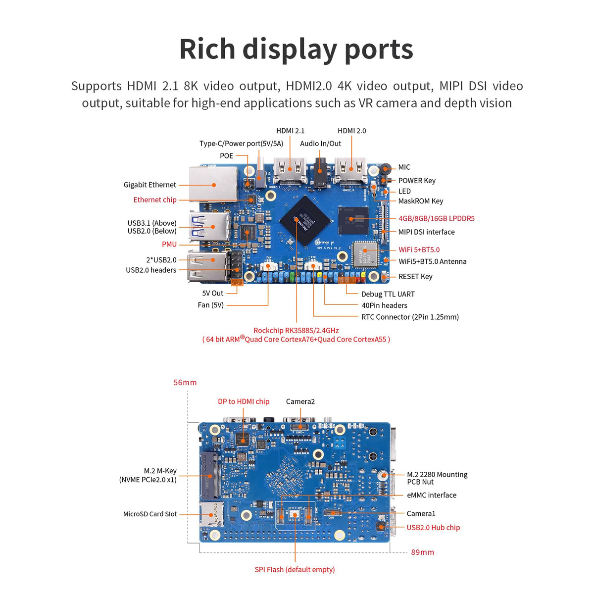 Orange Pi 5 Pro Hardware Parametersmaster Chip: Rockchip Rk3588S (8Nm Lp Process)Cpu: 8-Core 64-Bit Processor Big.Little Architecture: 4-Core Cortex-A76 And 4-Core Cortex-A55, Big Core Cluster Is 2.4Ghz, And Little Core Cluster Is 1.8Ghz Frequency.Gpu: Arm Mali-G610 Built-In 3D Gpu Compatible With Opengl Es1.1/2.0/3.2, Opencl 2.2 And Vulkan 1.2Npu: Embedded Npu Supports Int4/Int8/Int16 Mixed Operation, With Up To 6Tops Computing Powerpmu: Rk806-1Ram: Lpddr5 496Pin:4Gb/8Gb/16Gb (Optional)Memory: Emmc Socket: Supports Emmc Module (Optional) Spi Flash (Default Empty) Note:Either Emmc Socket Or On-Board Spi Flash Is Preferred. Microsd (Tf) Slot M.2 M-Key Slot: Nvme Ssd Or Sata Ssdusb: Usb3.1 Gen1 * 1;Usb2.0 *1;Usb Hub:Usb2.0 *2(Type A)+Uab2.0*2 Row Of Pinsvideo Output: Hdmi2.1 Up To 8K @60Hz Hdmi2.0, Up To 4K @60Hz Dp1.4 Alt 2Lane To Hdmi2.0: Lt8711Uxd_U2 Mipi 4 Lane, Up To 4K @60Hzcamera:2*Mipi 4 Laneaudio: Codec: Es8388 3.5Mm Headphone Jack Audio Input/Output Input: Onboard Mic Hdmi 2.1 Earcethernet:10/100/1000Mbps Ethernet With Poe+ Support (Poe+ Hat Required)Wi-Fi+Bt Module:Onboard Wi-Fi5+Bt 5.0/Ble Module: Ap6256Pcie M.2 M-Key Socket M.2 M-Key Slot Supports Access To Nvme Ssd Or Sata Ssdexpansion Port: Dual-Row Pin: 2.54Mm 40Pin Configurable Uart, Pwm, I2C, Spi, Can, Gpio And Other Functional Interfacesbutton:1* Maskrom, 1*Reset, 1 * Powerpower Source:Supports Type-C Power Supply, 5V @ 5Aled: Rgb Led Three-Color Indicator Status Indicator: Greenfan: 5V 2Pin 1.25Mm Socketrtc: 3V 2Pin 1.25Mm Socketappearance Specification Introductiondimension: 89Mm*56Mm*1.6Mmweight: 62G
