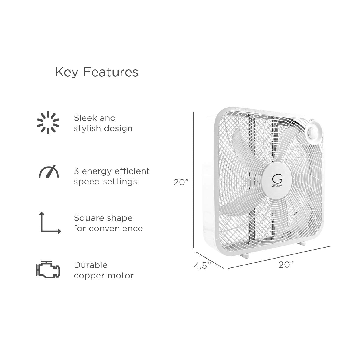 The Genesis 20-Inch Box Fan Is An Energy Efficient Fan With Innovative Design. It Has Been Constructed With A Durable Copper Motor To Last Longer. This Powerful Floor Fan Is Perfect For Cooling A Bedroom Or An Office. The 20' Head Gives You The Option To Place It On The Floor, On A Dresser, Or On A Table. The 3 Fan Speeds Give The Option Of How Cool You Want The Fan To Blow. This Fan Has Been Etl Listed With Ul Approval And Employs Overload Safety Protection With A Fuse In The Plug.