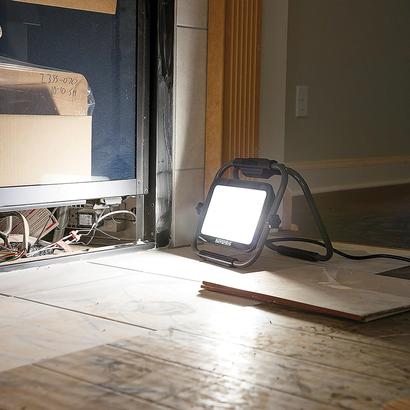 The Genesis 6,500 Lumen Foldable LED Work Light delivers incredible Illumination wherever you need it. This portable light is equipped to handle your next project thanks to its 5,000K bright white light and rugged design. The impact-resistant glass lens with its bright light, all-metal housing, and foldable stand is an ideal choice for the home or workplace. Plus, Genesis LED lights run cooler with more lumen output per dollar!