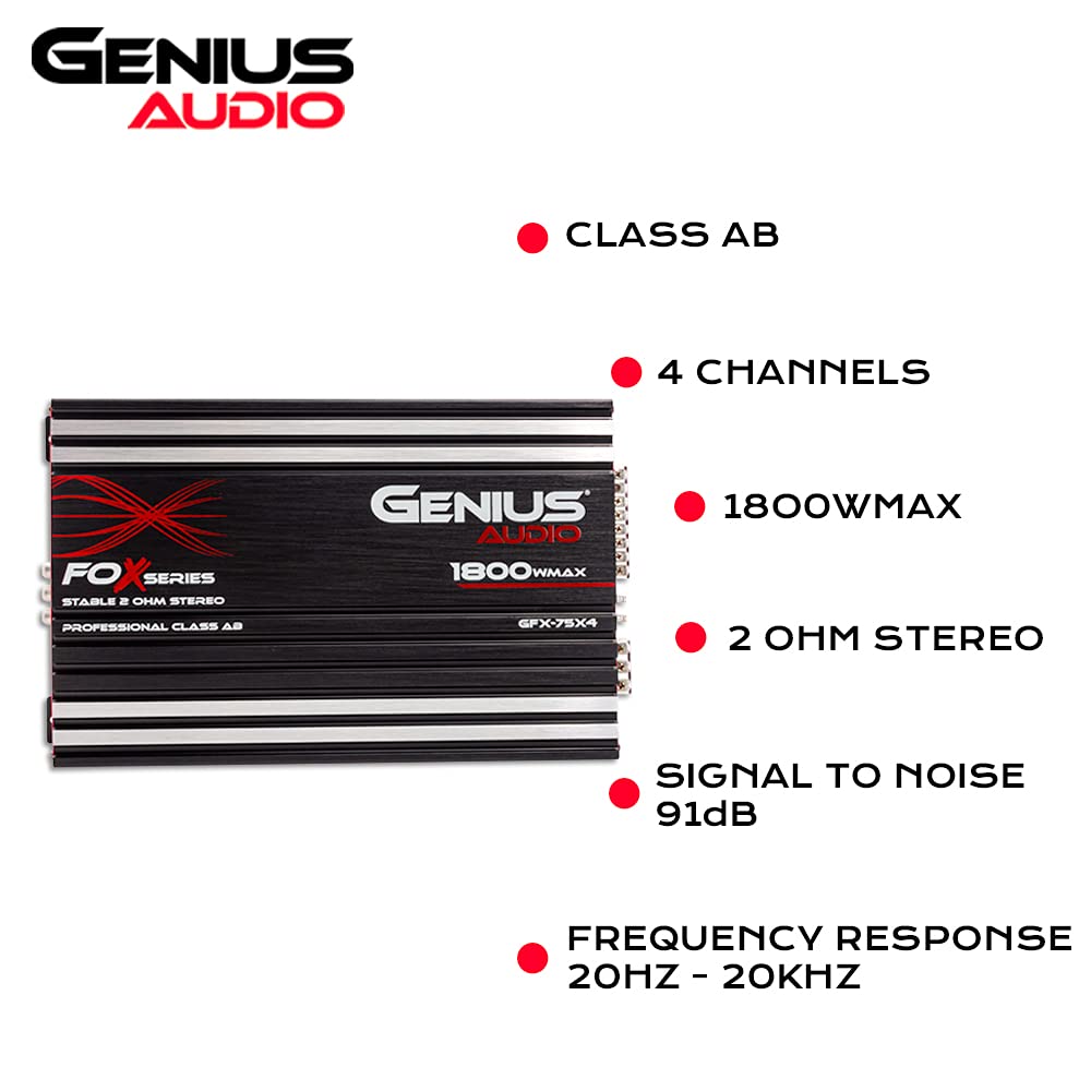 Genius Audio Gfx 75X4 Full Range Powered Car Amplifier Multichannel 1800 Watts Max Class Ab 2 Ohm Stable With Power Protection System To Boost Speaker And Woofer Performance