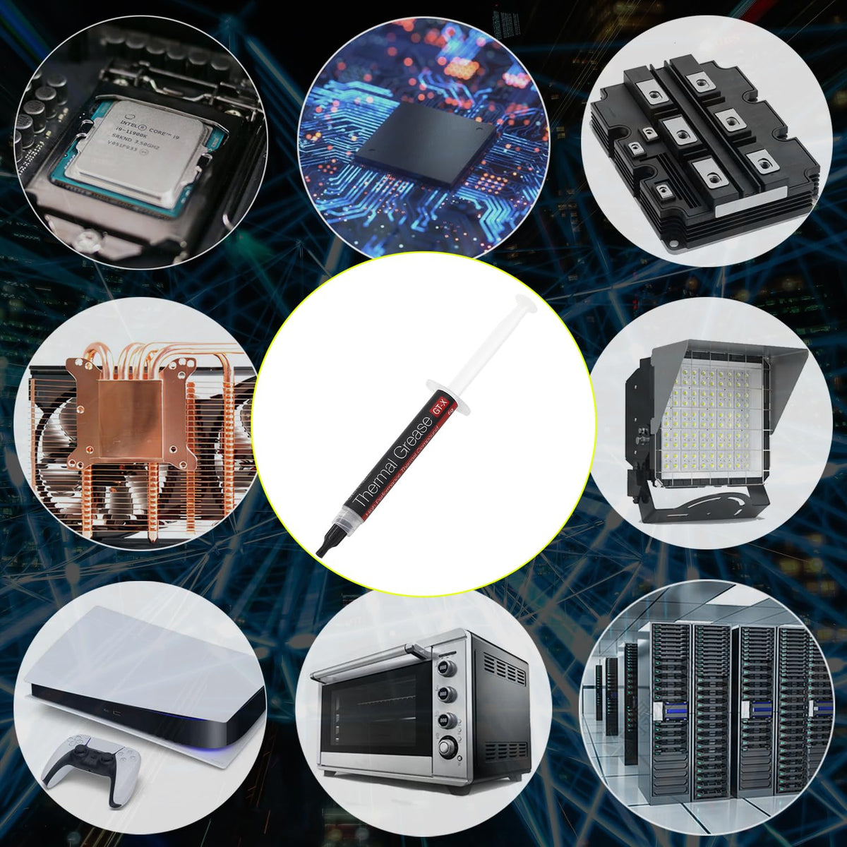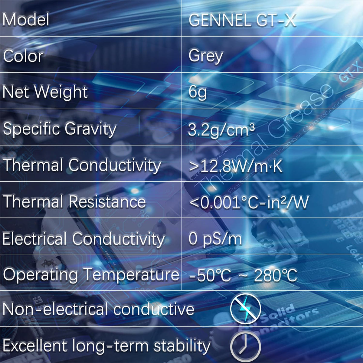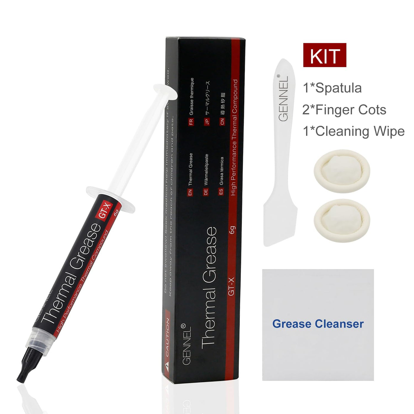 * Ultra-High Thermal Conductivity: High Quality Compound Ingredients, Thermal Compound Paste Has An Ideal Consistency, Provide You With Excellent Heat Dissipation Effect. * New And Improved: Ingredient Optimization And The Performance Is Improved Significantly. Wide Working Temperature -50? To 280?, Gt-X Thermal Paste Has Higher Thermal Conductivity And Lower Thermal Impedance. * Easy To Clean And Use: Viscously Balanced Formula Allow For Easy Application And Clean Up. Comes With Cleaning Wipe, Finger Cots And Spatula. Easy To Handle Even For Beginners. * Long-Lasting And Stable Performance: The Thermal Paste Uses Highly Stable And Reliable Compound Materials, Perfectly Extending The Service Life. * Safety Application: Non-Conductive, Non-Volatile, Flame Retardant, Which Eliminates The Risk Of Short Circuit And Discharges And Corrosion Damage To The Chip And The Radiator. Excellent For Pc Cpu Gpu Ps4 Ps5 Coolers Heatsink Etc. Package Includes: 1 X Gennel Gt-X 6G Thermal Grease 1 X Thermal Paste Spatula. 1 X Cleaning Wipe 2 X Finger Cots