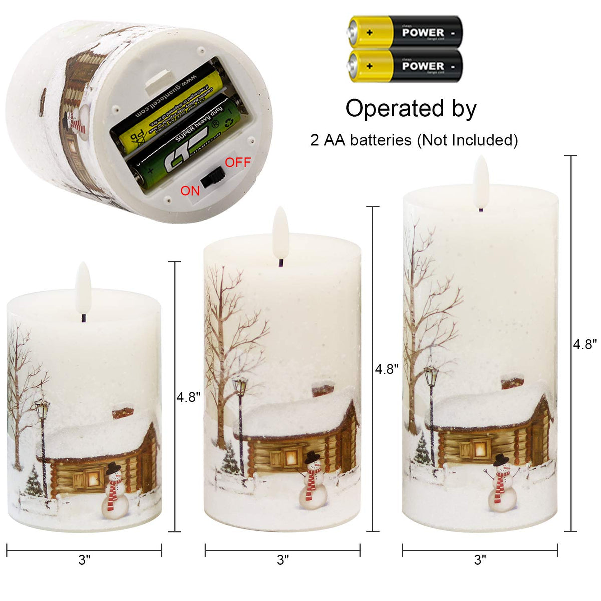 Christmas Flameless Candles Specification: *Candles Color: White *Candle Material: Real Wax With Led Light *Light Color: Warm Light *Decal: Christmas Snowman *Features: Flameless, Flickering, Timer,Remote *Application: Christmas *Timer: 6 Hours Package Included: - 1 X Christmas Flameless Candles (Size: D 3'' X H 4'') - 1 X Christmas Flameless Candles (Size: D 3'' X H 5'') - 1 X Christmas Flameless Candles (Size: D 3'' X H 6'') - 1 X User Manual One Remote Control All Candles: *On/ Off: Control Candles On/Off *Light: Flickering/ Non-Flickering *Brightness: Increase/ Decrease Brightness *Timer: 2/ 4/ 6/ 8H Timer Mode *For Example, If You Set The 6 Hour Timer At 16:00, Then These Flameless Taper Candles Will Light 6 Hours And Turn Off Themselves At 22:00. And Will Automatically Turn On Again At 16:00 Next Day, Cycle Every 24 Hours Battery Operated & Safe: *Battery Operated: Flameless Candles Requires 2 Aa Batteries(Not Included) *No Mess,No Flame More Tips: * This Candle Is Made Of Real Wax And Is Flammable. Do Not Attempt To Light This Candle * Keep Out Of Direct Sunlight, Away From Heat Sources And Out Of Extreme Temperatures Or Your Candle May Soften Or Melt * There Will Be Slight Battery Drain In Timer Mode Even If The Flameless Candle Are Not Light * Please Remove The Batteries If Plan Not To Use For A Long Time