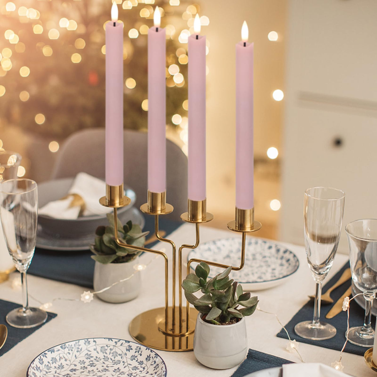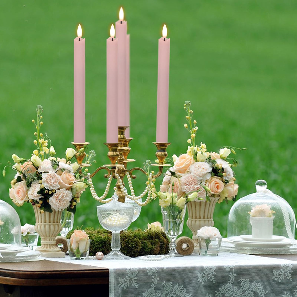 Q: Can I use these candles in a candlestick holder?A: Yes, the GenSwin Flameless Pink Taper Candles can be used in candlestick holders, or they can stand alone as they are designed to fit standard taper candle spaces.