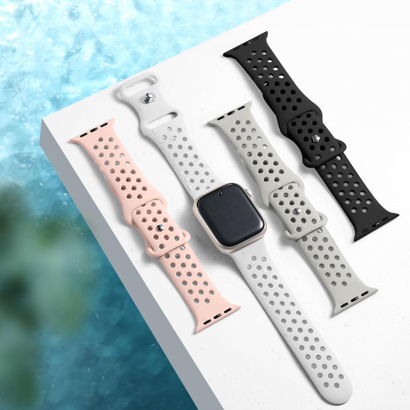 Q: How do the air holes in the band enhance comfort during workouts?A: The sport band features compression-molded perforations designed for breathability. These air holes allow sweat to evaporate quickly, preventing discomfort and stickiness during exercise, making it ideal for running, swimming, and other sports.
