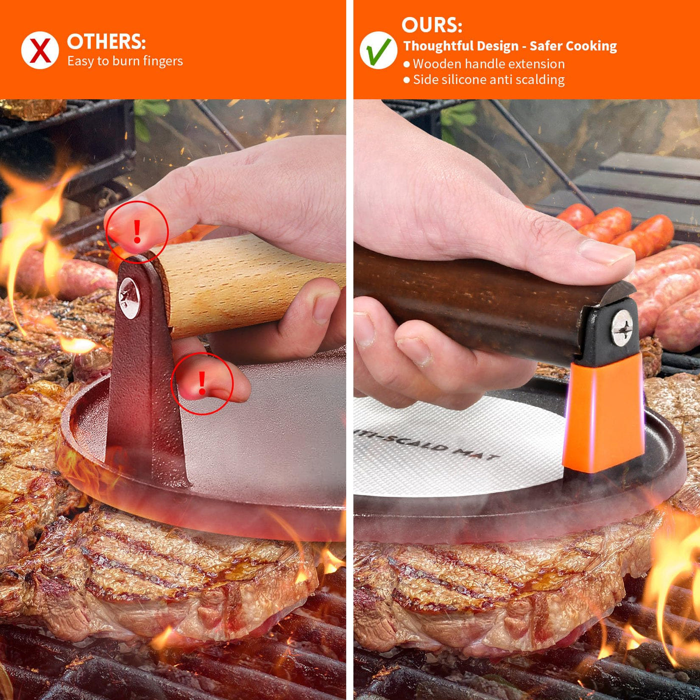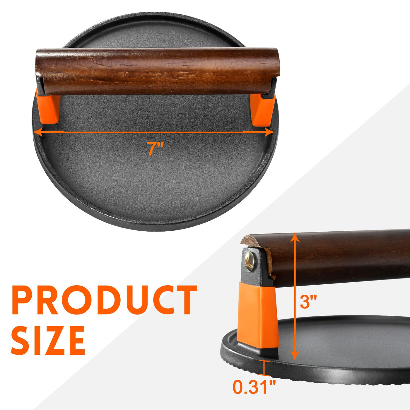 ?Superior Quality?: Ggc Smash Burer Press Made Of Heavy-Duty Cast Iron, Durable And Sturdy, Not Easily Deformed. Food-Grade Cast Iron Material Is Easier To Restore The Original Flavor Of Food. Perfect For Patties, Sandwiches, Bacon, Veggies, Eggs On The Griddle?The Secret To The Best Burger-Equalized Weight Distribution?: Ggc Cast Iron Smash Burger Press Weigh 2.2 Pounds, Specially Designed For Use On The Grill Or Griddle. Really Presses Out Excess Fat From Food, Cooking Burgers And Make Moist Juicy Patties With Crispy Edges?Cool&Comfortable?: Ggc Smash Burger Press Uses An Upgraded Wooden Handle Design. The Classic And Beautiful Wooden Handle Feels Comfortable To Hold And Prevents Burns. The Silicone Covers On Both Sides Of The Burger Press Can Effectively Prevent Burns Caused By Accidentally Touching The Edge Of The Burger Maker During Cooking. Ggc Burger Press Truly Allows You To Cook Comfortably!?Professional Texture Design ?: The Bottom Of The Burger Press Is Designed With A Waffle Texture, Which Can Really Press Out Excess Fat From Food And Leave Beautiful Grill Marks On The Food, Allowing You To Experience Restaurant-Quality Burgers And Sandwiches At Home?Easy To Use And Clean?: Season And Preheat Before Use, Scrub Clean With A Soft Brush Under Clean Water After Use, Apply A Layer Of Vegetable Oil And Heat, Store In A Cool And Ventilated Place