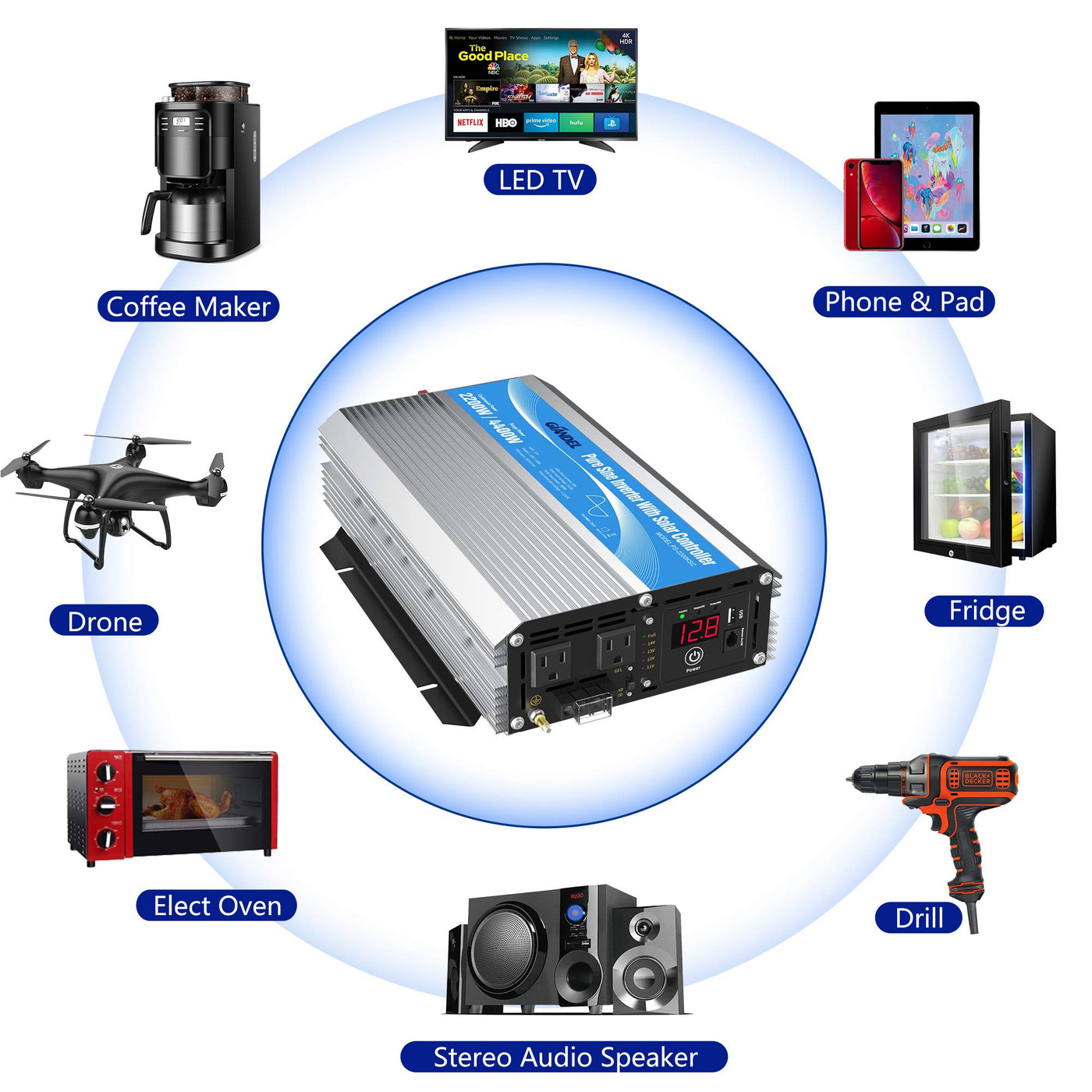 About Giandel A Leading Global Inverter Brand In Usa, Australia,Germany,France Etc,Devoted To Providing Quality Inverters With A Better Price For Consumers. A Must-Have For Your Road Trips, Vacations, Outdoors, Emergency Kits And More. Why Need Pure Sine Wave Inverter?Pure Sine Wave Inverters Are Recommended For Sensitive Electronic Equipment Which Requires Cleaner Ac Power To Operate Effectively.Such As Fan,Lcd,Fridge,Air Compressor, Water Pump Etc. Specifications: Power,More Powerful Than 2000W Inverter (2 Ac Outlets): 2200W Rated, 4400W Peak Usb Output: 1Xdc 5V/2.4A(Max) Output Wave: Pure Sine Wave Thd
