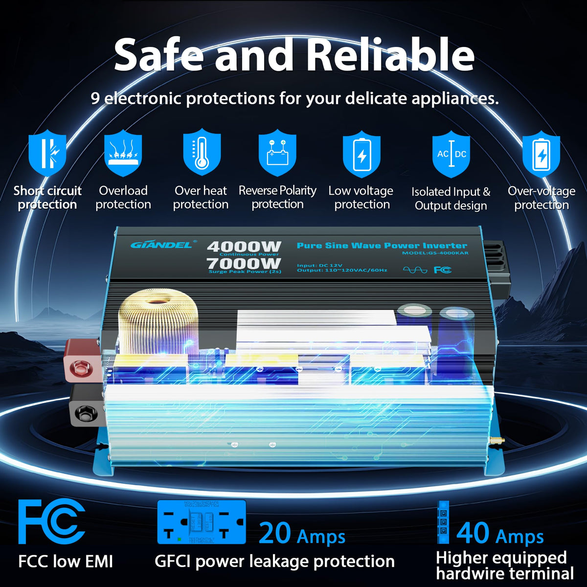 Giandel 4000 Watt Pure Sine Wave Power Inverter With Gfci Outlets For Rvs,Off-Grid Solar System 7000Watt Surge Power
