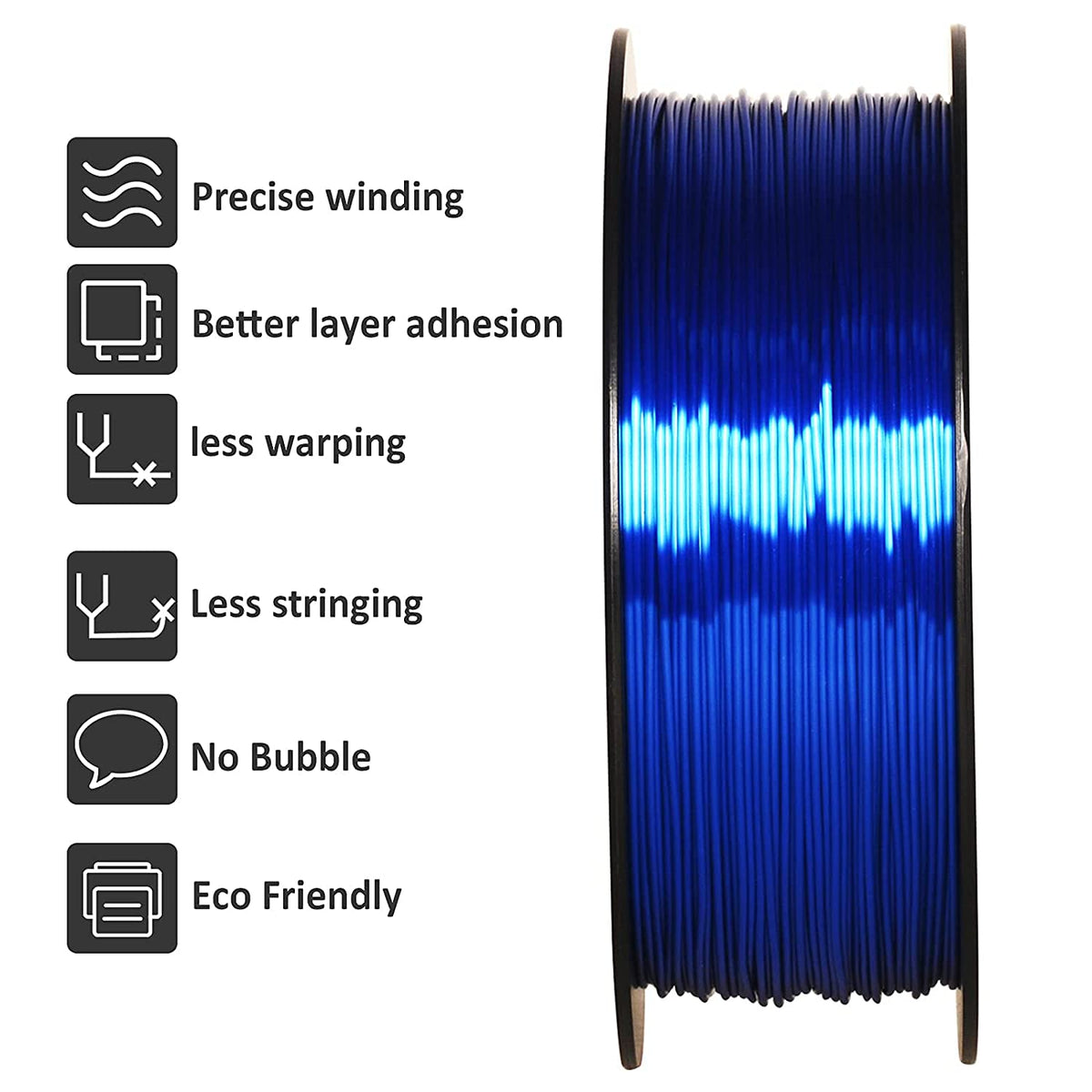 Q: What are the key features of the silk royal blue PLA filament?A: The silk royal blue PLA filament offers excellent dimensional accuracy of +/- 0.03mm, vibrant color, and a smooth finish, making it ideal for high-quality prints.