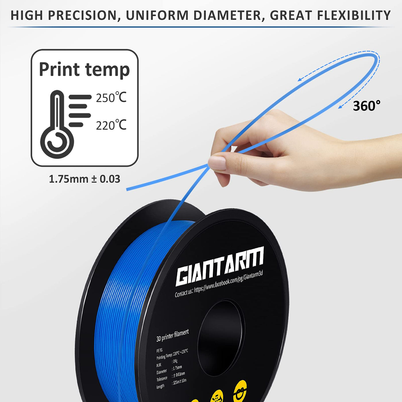 Q: How does the GIANTARM Blue PETG filament compare to PLA and ABS?A: The GIANTARM Blue PETG filament combines the benefits of both PLA and ABS. It offers high temperature resistance, excellent adhesion, and durability, while being easy to work with and environmentally friendly, making it a superior option for many printing projects.