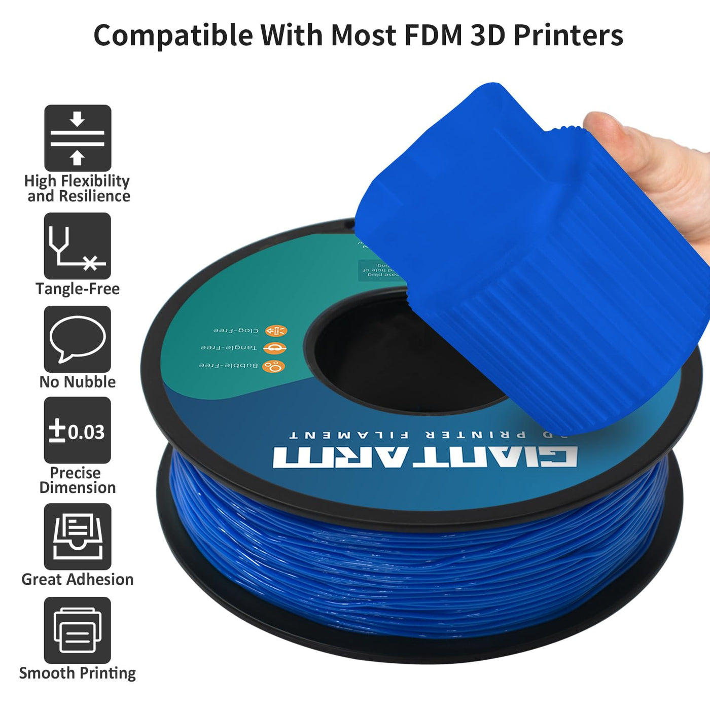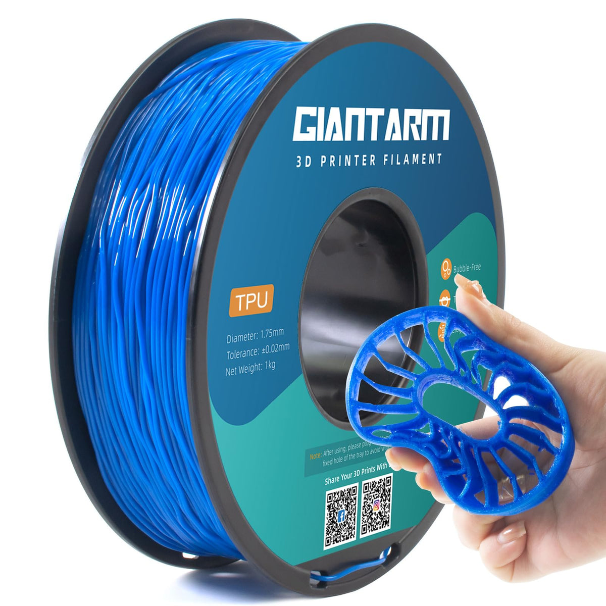 Q: What makes GIANTARM TPU filament different from other filaments?A: GIANTARM TPU filament is specifically engineered with a clog-free and bubble-free design, ensuring a smoother and more stable printing experience compared to standard filaments.