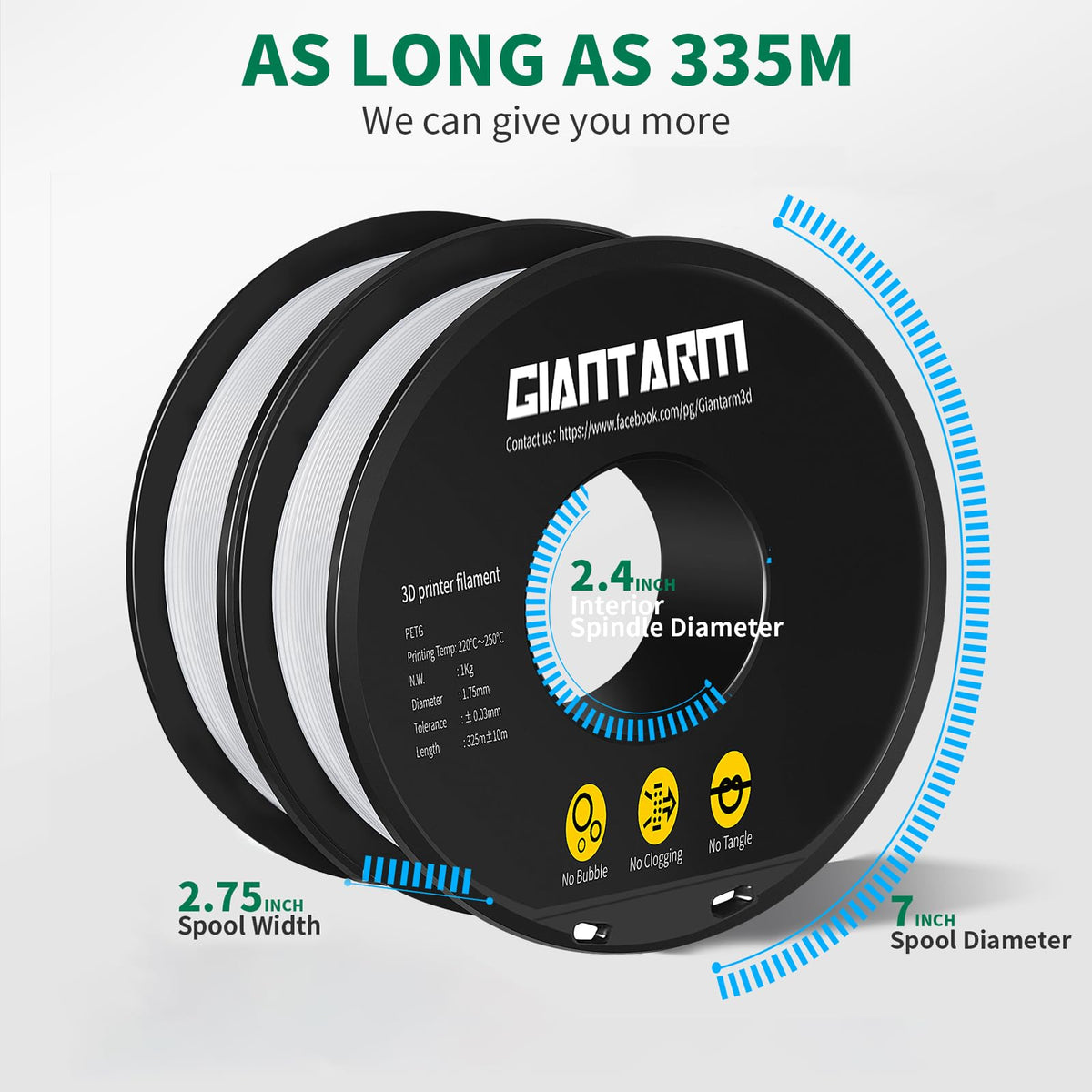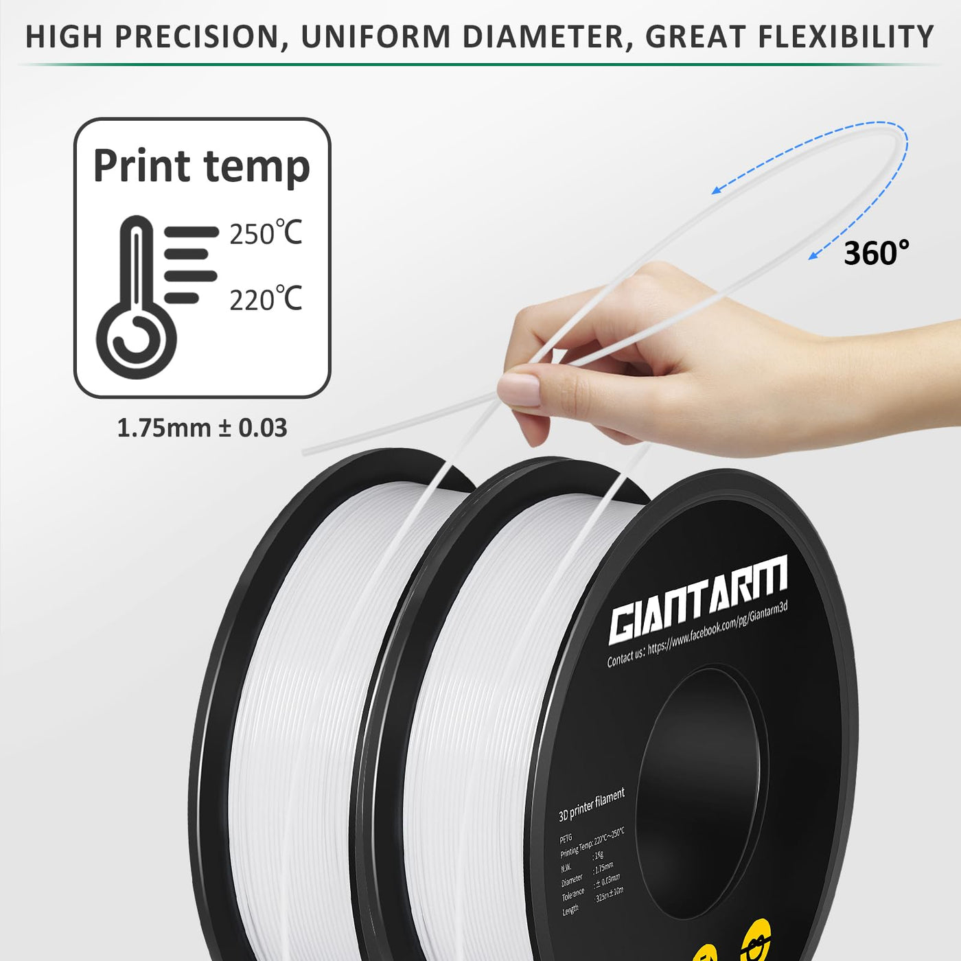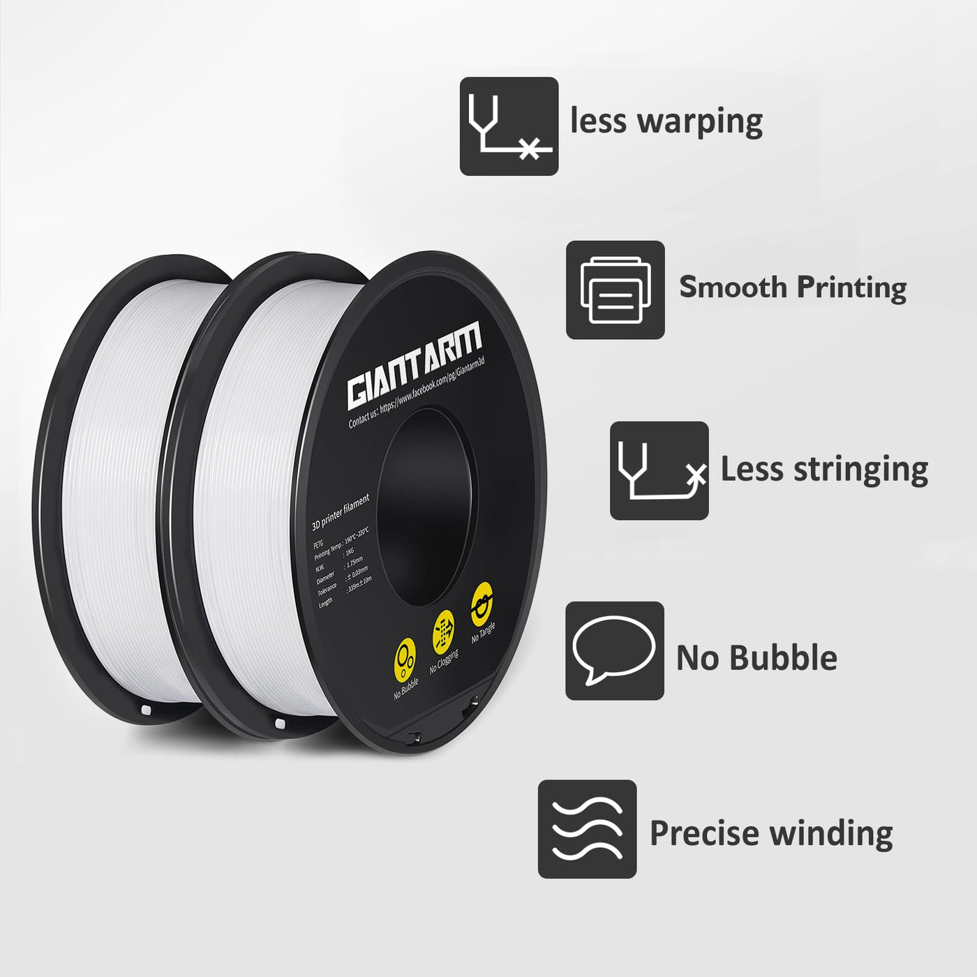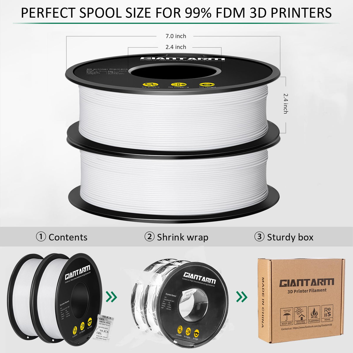 Q: How is the GIANTARM PETG Filament packaged to ensure quality?A: The GIANTARM PETG Filament comes vacuum sealed with a desiccant to prevent moisture absorption and keep out dust, which helps avoid nozzle clogging during printing.