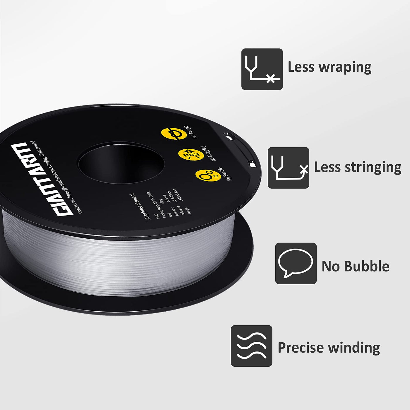Q: How long is the GIANTARM PETG filament roll, and what is its weight?A: The GIANTARM Transparent PETG filament comes in a roll that is 335 meters (approximately 1100 feet) long and weighs 1 kg (2.2 lbs), providing ample material for a variety of 3D printing projects.