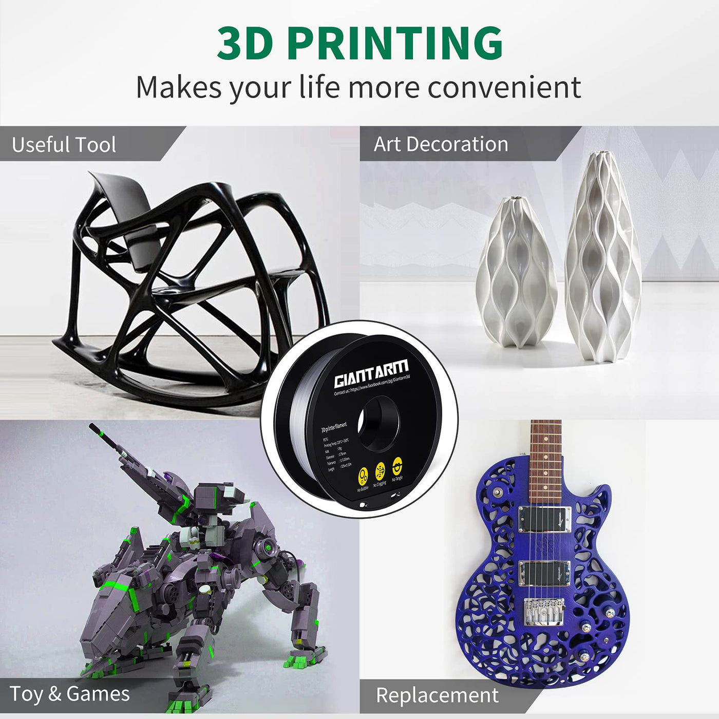 Performance: Petg Is A Transparent Plastic That Combines The Advantages Of Pla And Abs, High Temperature Resistance And Easy Molding. It Can Be Easily Attached To The Printing Bed, And The Material Is Discharged Smoothly When Printing The Model, And It Is Not Easy To Block The Head. The Printed Product Has High Gloss, High Strength, High Detail Resolution And Smooth Surface, With A Translucent Effect, The Product Is Not Easy To Break, And It Is Environmentally Friendly And Odorless. Why Giantarm 1.Innovative Research Team 2.Extensive Experience On 3D Printing 3.Professional Customer Service 4.Superior Geographic Conditions 5.Prospect Worldwide Market Key Features High Purity Material With Low Shrinkage Ultra Smooth,No Tangle,No Warpping,No Bubbles,No Odor Doesn'T Absorb Moisture Easy Adhesion Safe For The Environment Specification: Recommended Extrusion/Nozzle Temp: 220C - 250C (428F~ 482F) Heated Bed Temp: 80C - 90C (176F~ 194F) Printing Speed: 30-60(Mm/S) Filaments Diameter And Accuracy: 1.75 Mm +/- 0.03 Filaments Net Weight: 1 Kg (2.2 Lbs) Filaments Length: 335M(1100Ft)