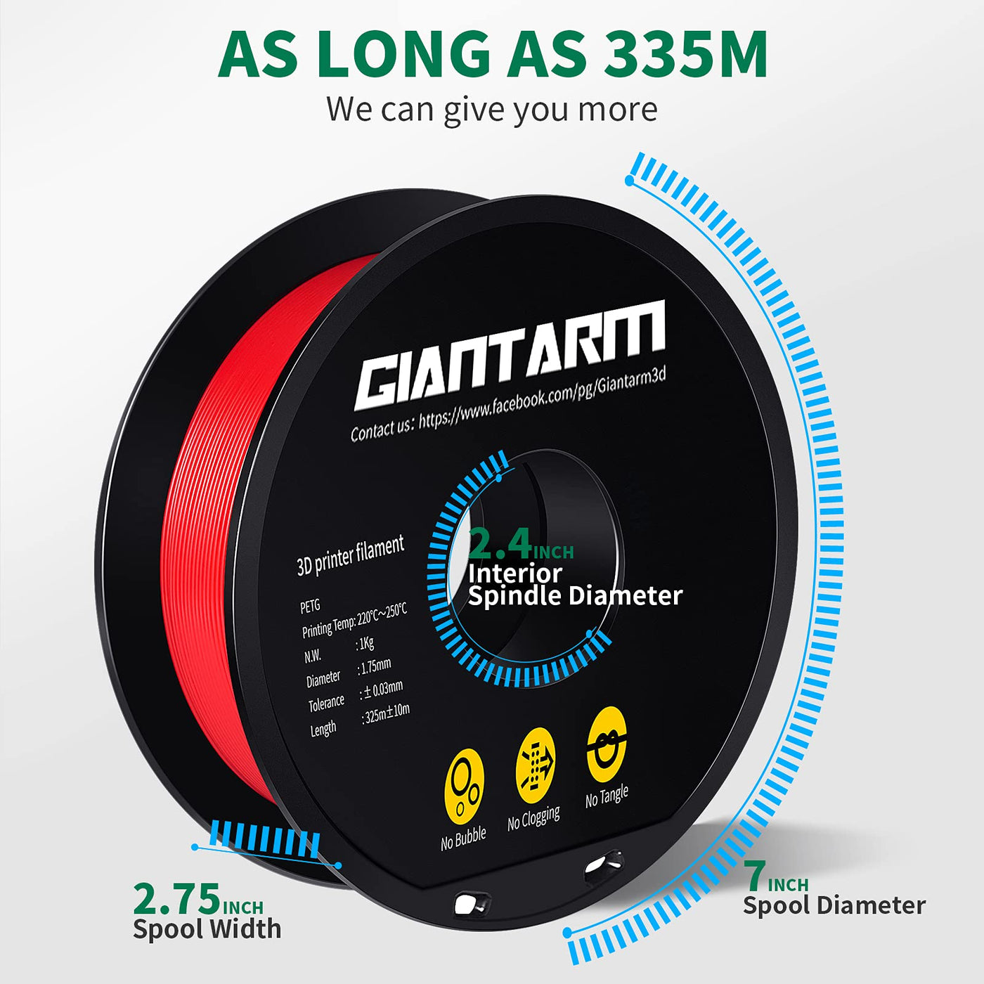 Giantarm Red Petg 3D Printer Filament Toughness Enhanced 1Kg (2.2Lbs), 1.75Mm Dimensional Accuracy +/ 0.03Mm, 1080 Feet(330M)/Ro