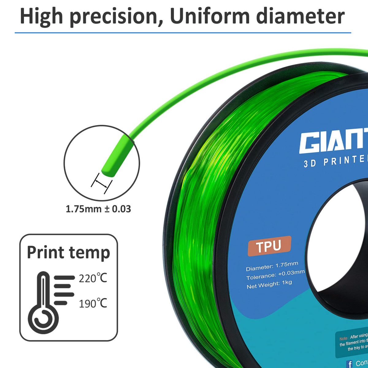 Why Giantarm 1.Innovative Research Team 2.Extensive Experience On 3D Printing 3.Professional Customer Service 4.Superior Geographic Conditions 5.Prospect Worldwide Market Key Features High Purity Material With Low Shrinkage Ultra Smooth,No Tangle,No Warpping,No Bubbles,No Odor Doesn'T Absorb Moisture Easy Adhesion Safe For The Environment Specification: Recommended Extrusion/Nozzle Temp: 190C-220C (374?~428?) Heated Bed Temp: 50C-70C (122?~158?) Printing Speed:30-70Mm/S Filaments Diameter And Accuracy: 1.75 Mm +/- 0.02Mm Filaments Net Weight: 1 Kg (2.2 Lbs) Filaments Length: 335M +/-10 (1100Ft)
