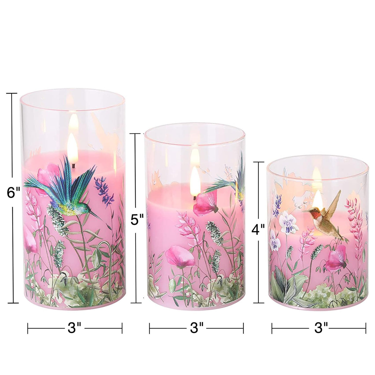 Girimax Pink Floral Hummingbird Flameless Candles In Glass Holders, Flickering Led Candles With Remote Flickering Realistic Candles - The Newest Flame Stimulation Technology Makes These Led Candles With So Realistic Black Wick And The Glass Led Candles Flicker So Beautifully And Convincingly, Bringing A Realistic Flame Experience That You And Your Guests Will Be Definitely Impressed.10 Key Remote Control - You Don'T Leave Your Cozy Bed To Open/Close These Candles Manually, All Candles Are Easily Operated Through The Remote Control, Which Allows To Turn On/Off, Set 2/4/6/8 Hours Timer, Adjust Brightness, Set Flickering/Static Flame, Keep Always On.Elegant Glass Candles Set - With Bright And Shiny High-Grade Glass, The Glass Reflects A Lot Of Beautiful Lights, Great Decoration For Christmas, Wedding, Home Decor, Date, Birthday, Seasonal Festival Holiday Decor And A Great Gift. - Battery Flameless Candles, No Fire Risk, No Smoke, No Unpleasant Scent Or Or Messy Dripping Waxglass Candles Set:- 3 Pack Glass Candles, One 3X4 Inch, One 3X5 Inch, One 3X6 Inch Led Glass Candle, Each Candle Takes 2 Aa Batteries, Not Included- 1 X Remote Control( 1X Cr2025 Coin Battery Included)- 1 X User Manualwarm Tips: This Candle Is Made Of Real Wax, Please Keep Out Of Direct Sunlight, Away From Heat Sources And Out Of Extreme Temperatures Or Your Candle May Soften Or Melt.