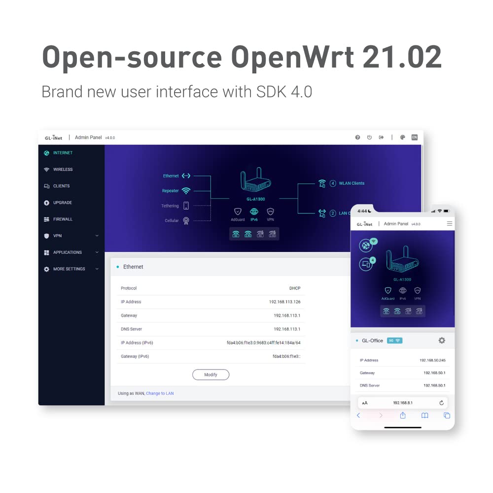 Gl.Inet Gl-A1300 (Slate Plus) Wireless Vpn Encrypted Travel Router- Easy To Setup, Connect To Hotel Wifi & Captive Portal, Phone Tethering, Range Extender, Assess Point, Pocket-Sized, Open Source, Nas