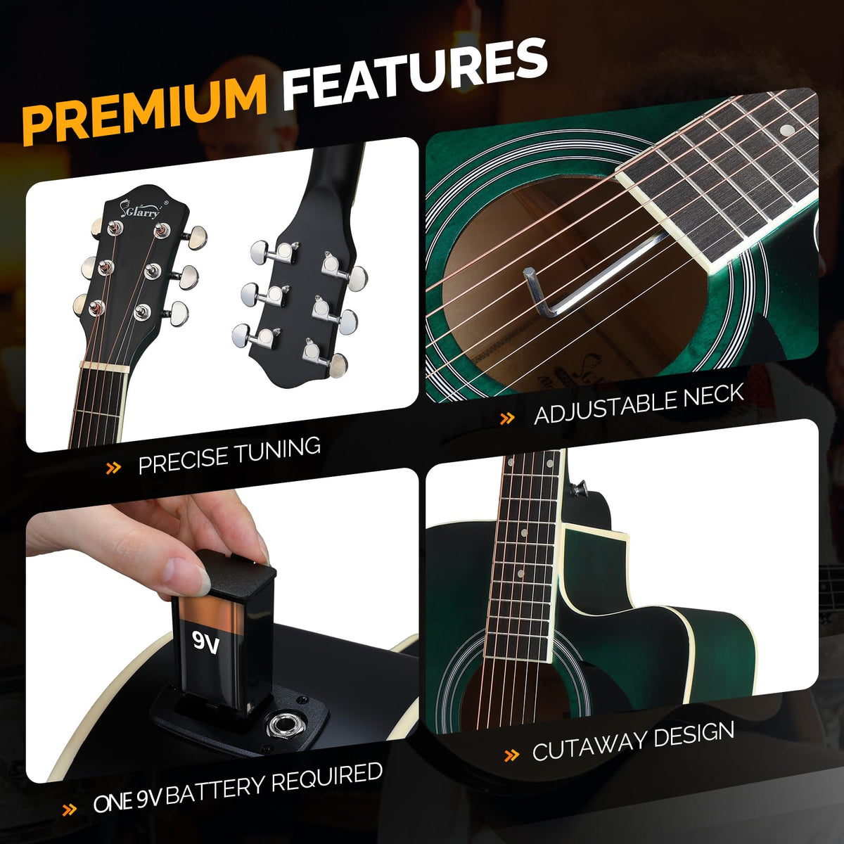Glarry Acoustic Electric Guitar Use A Cutaway Design. To Provide Players Premium Using Experience, Our Guitars Are Made Of High-Quality Basswood Body,Laurelwood Fretboard And Maple Wood Neck.The Rust-Resistant Property Of Phosphor Bronze Strings Allow This Guitar To Be Used For Years To Come. For Beginners, Our All-In-One Acoustic Electric Guitar Kit Is A Good Choice.