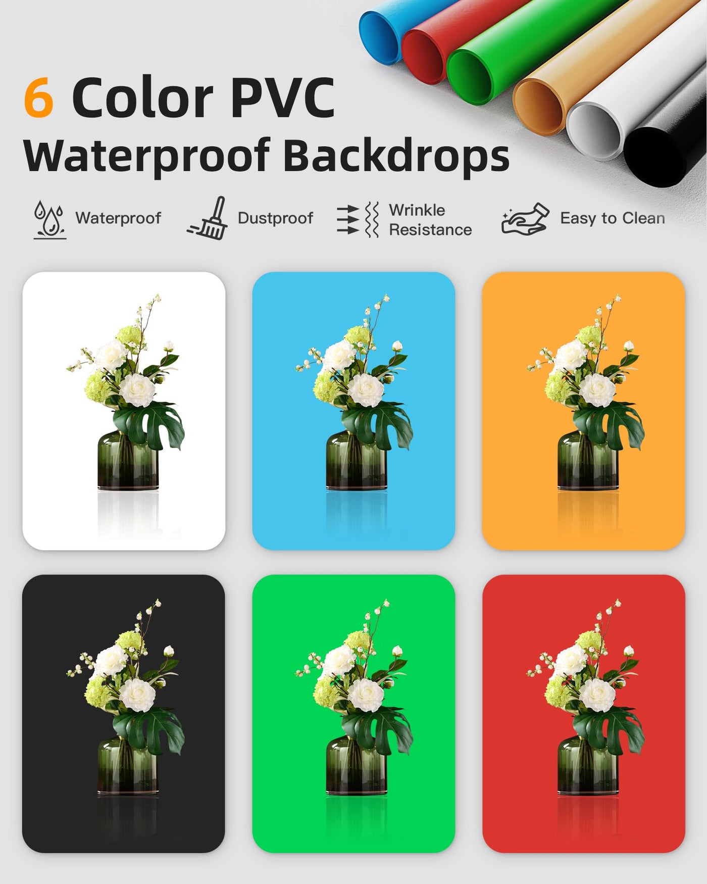Q: What materials are the color backdrops made of?A: The included 6 color backdrops are made of thicker Polyvinyl Chloride (PVC), ensuring they are sturdy, wrinkle-free, and easy to change for different shooting scenes.