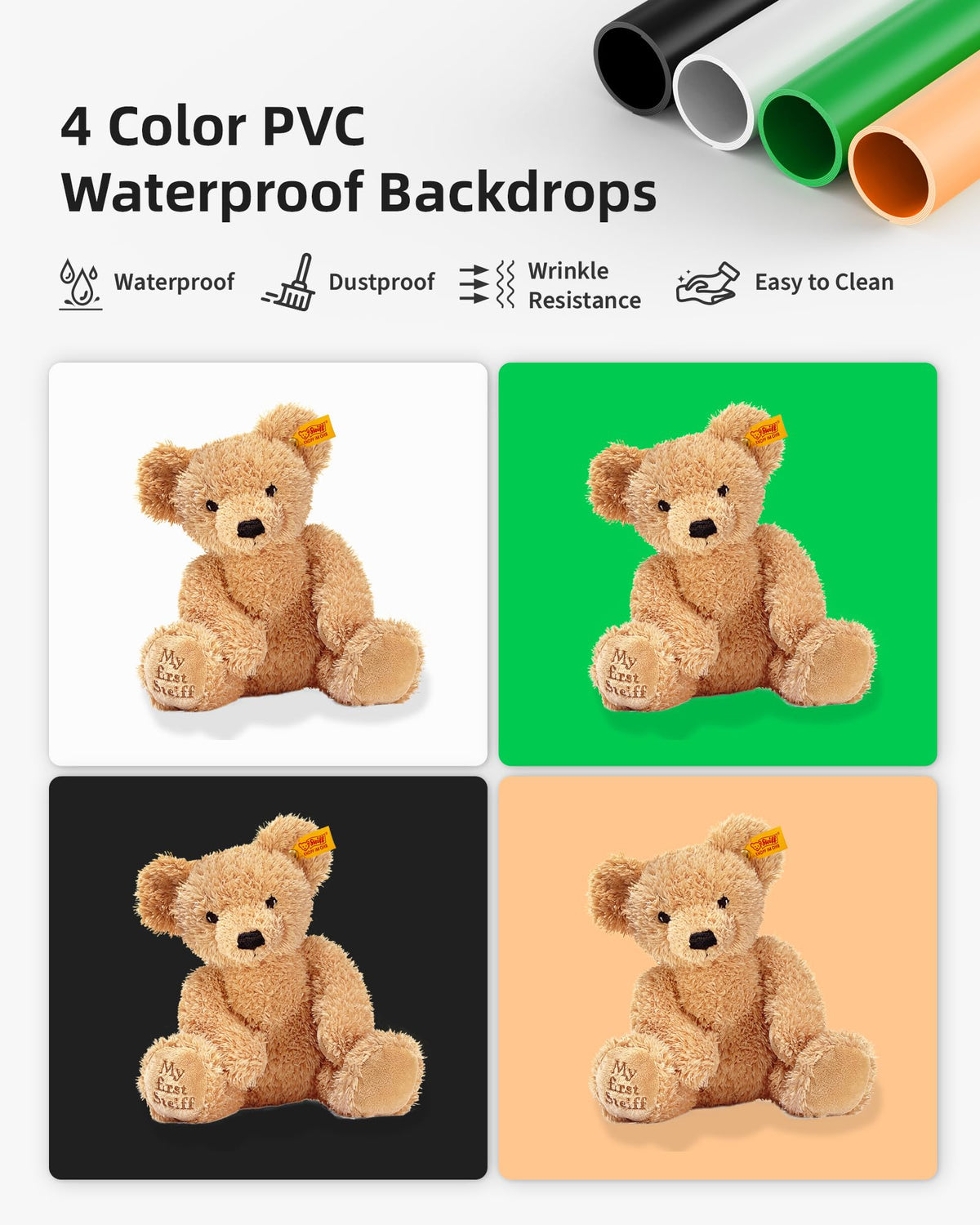 Q: Can I change the backgrounds of my product photos easily?A: Yes, the Glendan light box comes with 4 detachable PVC backdrops in different colors (Black, White, Orange, and Green), allowing you to effortlessly switch backgrounds to create captivating scenes for your products.