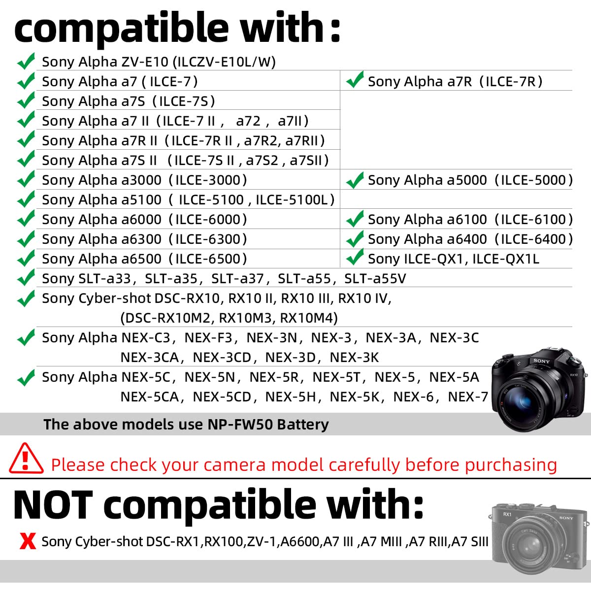 Sony Cyber-Shot Dsc-Rx10, Rx10 Ii, Rx10 Iii, Rx10 Iv, (Dsc-Rx10M2, Rx10M3, Rx10M4) Sony Alpha Zv-E10 (Ilczv-E10L/W) Sony Alpha A7 (Ilce-7) Sony Alpha A7R (Ilce-7R) Sony Alpha A7S (Ilce-7S) Sony Alpha A7 Ii (Ilce-7 Ii, A72, A7Ii) Sony Alpha A7R Ii (Ilce-7R Ii, A7R2, A7Rii) Sony Alpha A7S Ii (Ilce-7S Ii, A7S2, A7Sii) Sony Alpha A3000 (Ilce-3000) Sony Alpha A5000 (Ilce-5000) Sony Alpha A5100 (Ilce-5100, Ilce-5100L) Sony Alpha A6000 (Ilce-6000) Sony Alpha A6100 (Ilce-6100) Sony Alpha A6300 (Ilce-6300) Sony Alpha A6400 (Ilce-6400) Sony Alpha A6500 (Ilce-6500) Sony Ilce-Qx1, Ilce-Qx1L Sony Slt-A33, Slt-A35, Slt-A37, Slt-A55, Slt-A55V Sony Alpha Nex-C3, Nex-F3, Nex-3N, Nex-3, Nex-3A, Nex-3C, Nex-3Ca, Nex-3Cd, Nex-3D, Nex-3K Sony Alpha Nex-5C, Nex-5N, Nex-5R, Nex-5T, Nex-5, Nex-5A, Nex-5Ca, Nex-5Cd, Nex-5H, Nex-5K, Nex-6, Nex-7