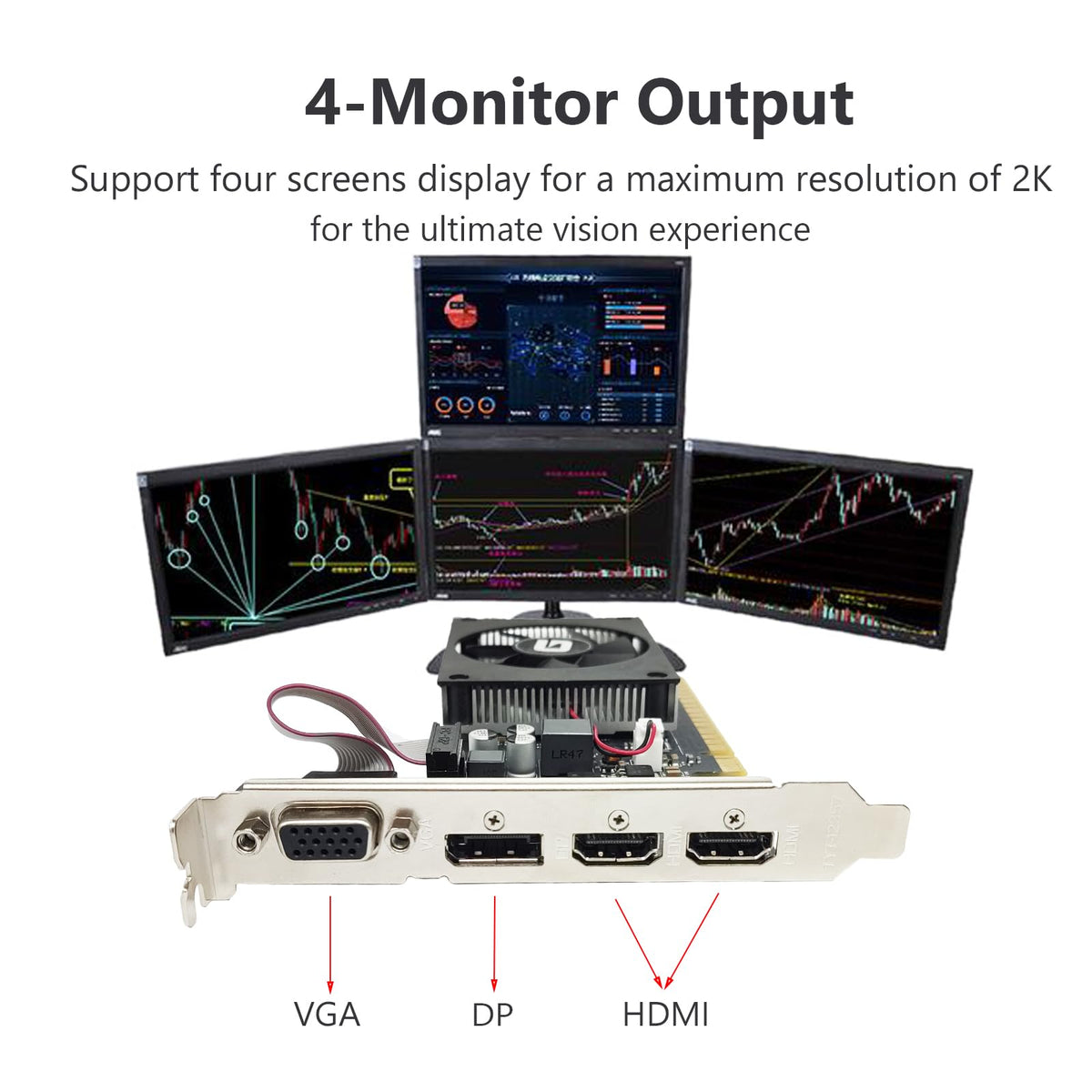 Q: What outputs are available on the Glorto GeForce GT 730?A: The graphics card includes dual HDMI and VGA ports, allowing for multiple display configurations, with HDMI supporting a maximum resolution of 2560x1600 and VGA supporting up to 2048x1536.