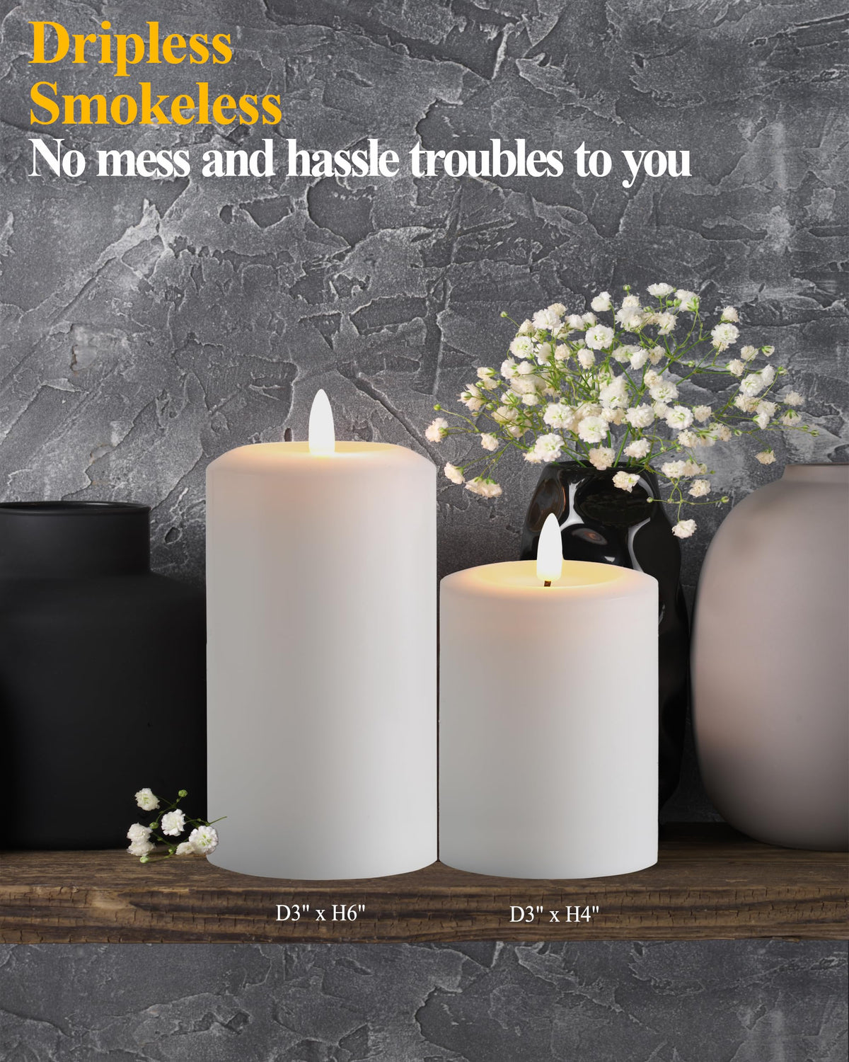 Q: What are the benefits of using flameless candles compared to traditional candles?A: Flameless candles, like the Gmnee 3"x4" candles, provide the warm ambiance of a real flame without the risks associated with fire and hot wax. They are safe around children and pets, eliminate the need for cleanup, and can be used in areas where traditional candles are not practical.