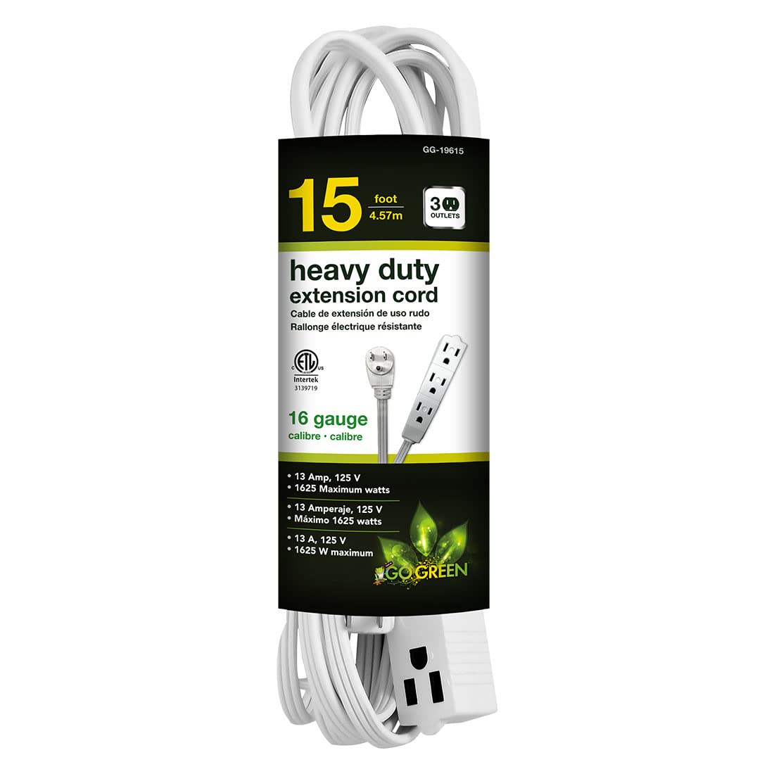 Go Green Power Inc. 15Ft Extension Cord With 3 Outlets, White Compact, Flush Fit Design, Heavy Duty, Grounded Plug Ideal For Home & Small Appliances Gg 19615